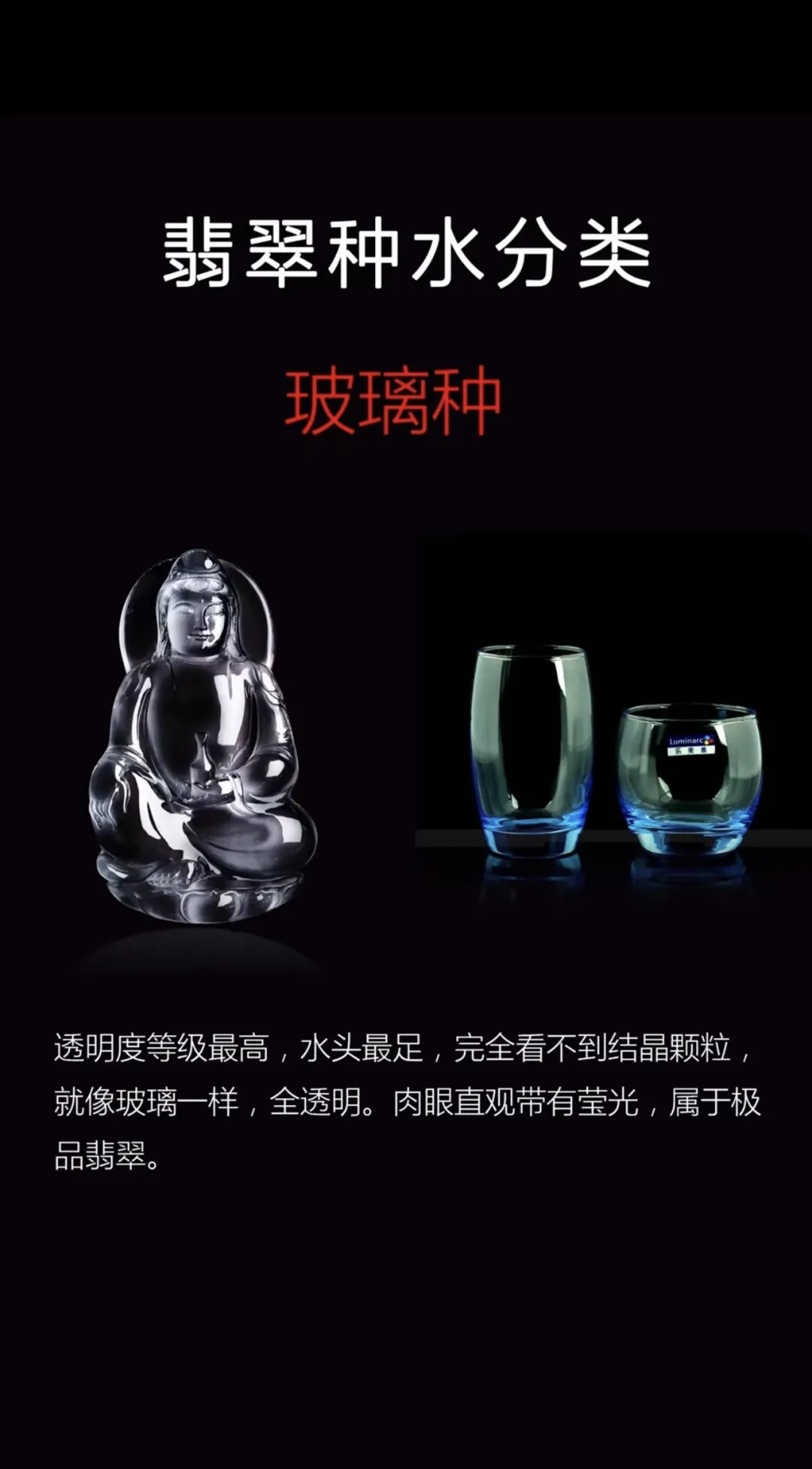透明度等级最高,水头最足,完全看不到结晶颗粒就像玻璃一样,全透明。肉眼直观带有莹光,属于极品翡翠。