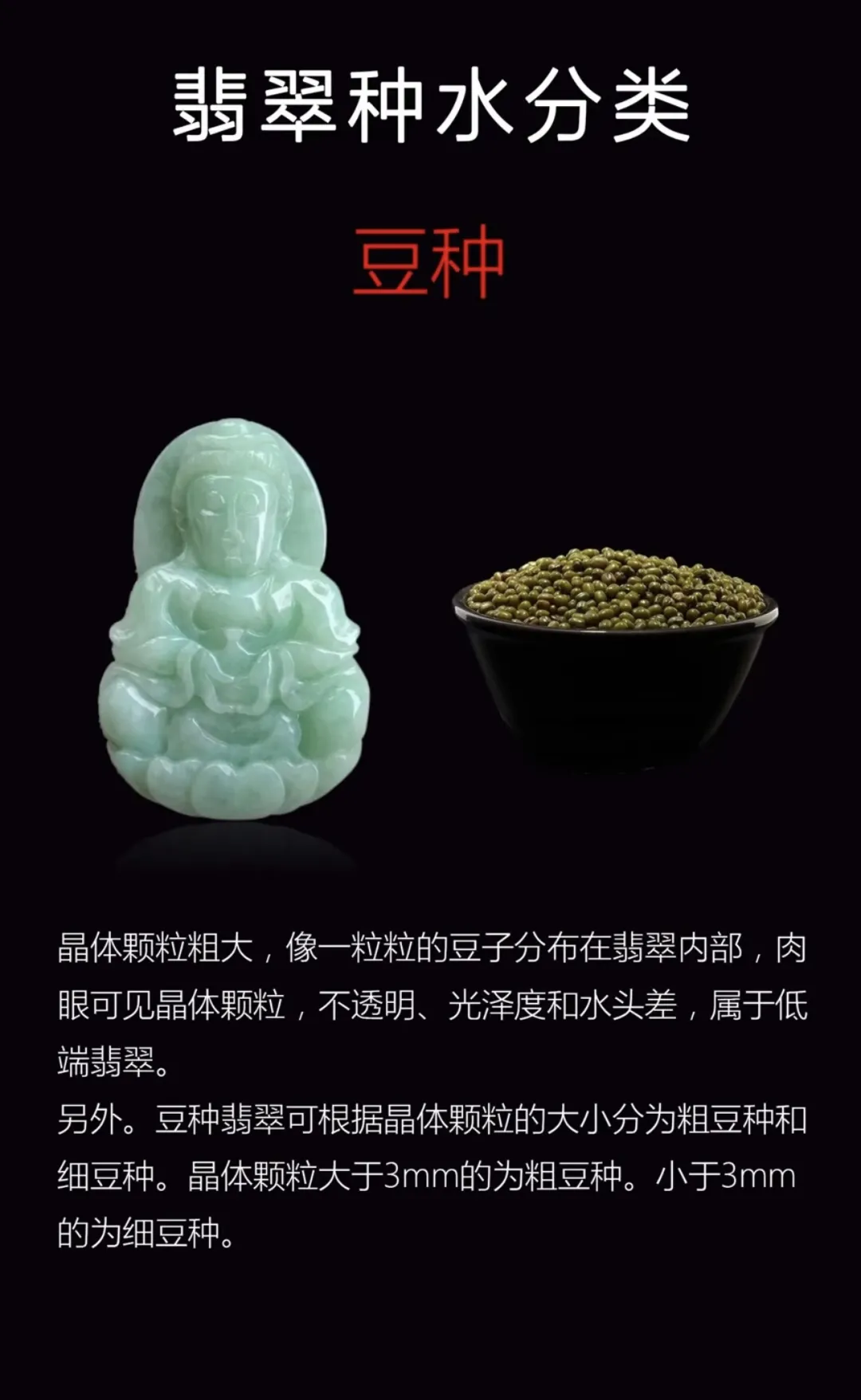 晶体颗粒粗大,像一粒粒的豆子分布在翡翠内部,肉眼可见晶体颗粒,不透明、光泽度和水头差,属于低端翡翠。另外。豆种翡翠可根据晶体颗粒的大小分为粗豆种和细豆种。晶体颗粒大于3mm的为粗豆种。小于3mm的为细豆种。