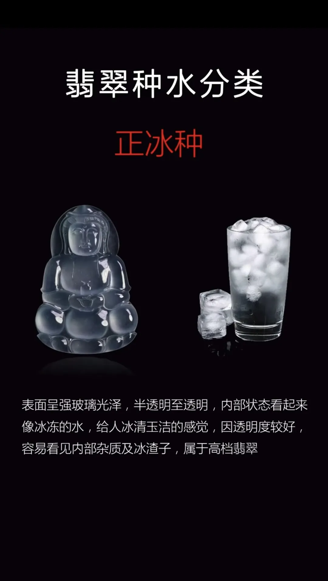 表面呈强玻璃光泽,半透明至透明,内部状态看起来像冰冻的水,给人冰清玉洁的感觉,因透明度较好,容易看见内部杂质及冰渣子,属于高档翡翠。
