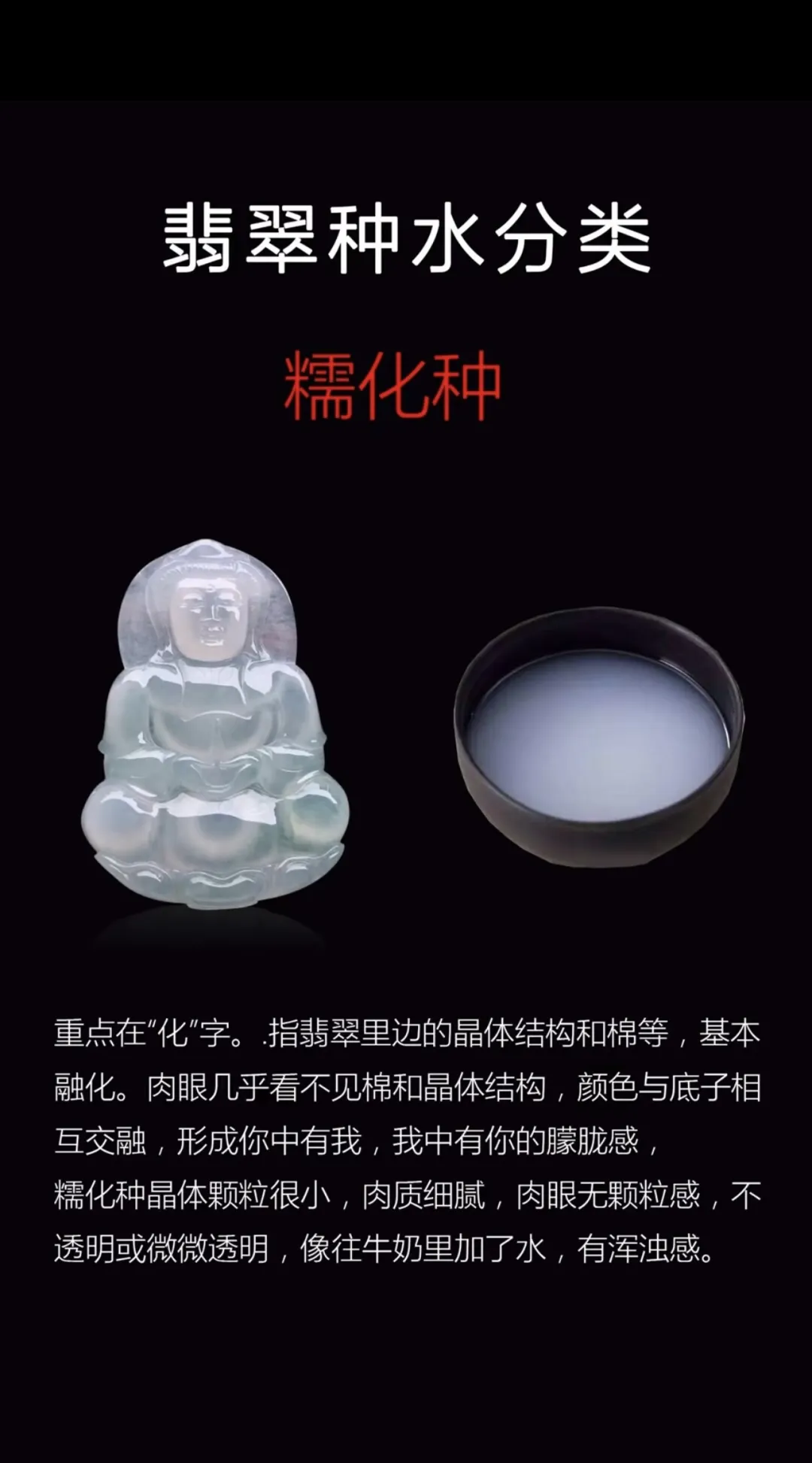 重点在”化”字。指翡翠里边的晶体结构和棉等,基本融化。肉眼几乎看不见棉和晶体结构,颜色与底子相互交融,形成你中有我,我中有你的朦胧感,糯化种晶体颗粒很小,肉质细腻,肉眼无颗粒感,不透明或微微透明,像往牛奶里加了水,有浑浊感。