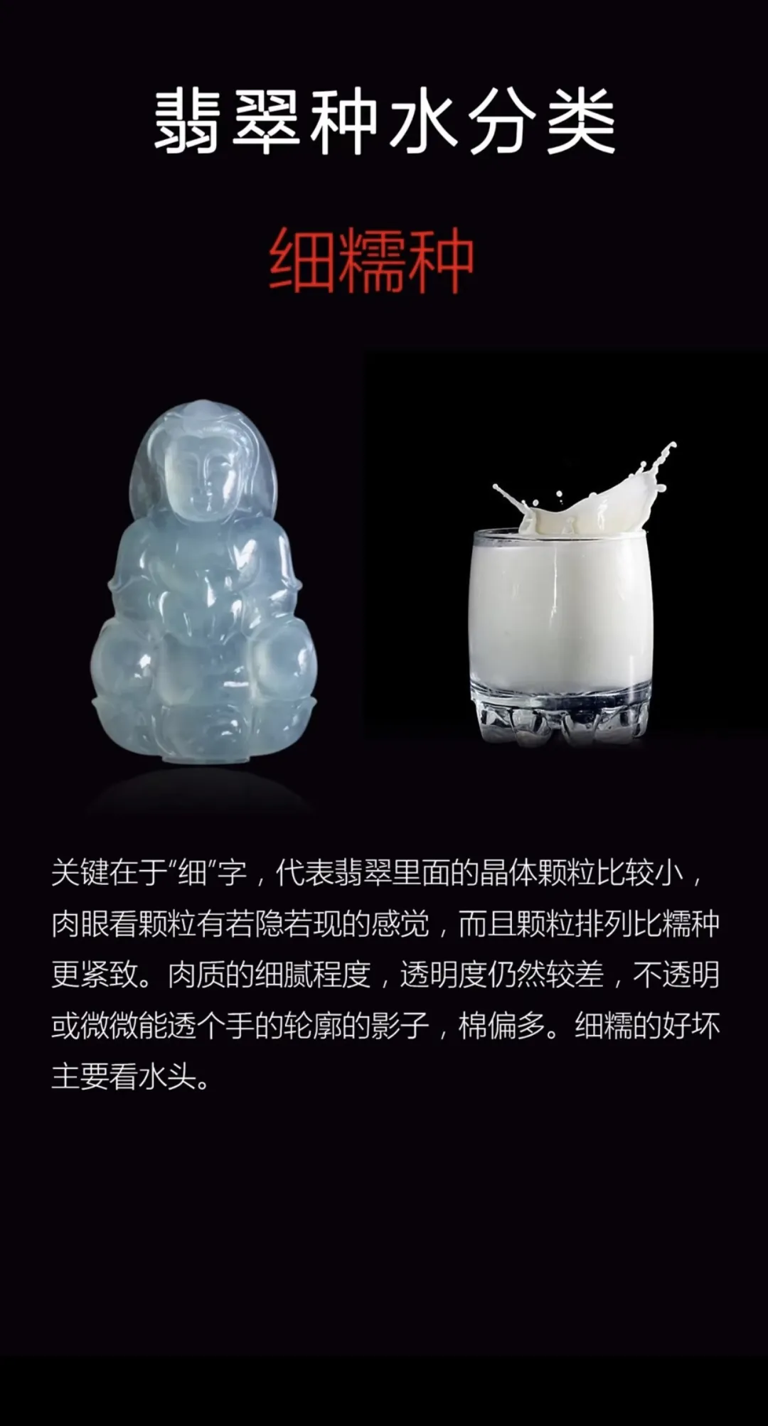晶体颗粒比豆种小,看起来就像捣成糊状的糯米饭的状态,隐约能看见晶体颗粒。不透明,有莹润、柔和、浑浊的质感,光泽偏向油性。按品质高低可分为:糯种、细糯、糯化、糯冰。