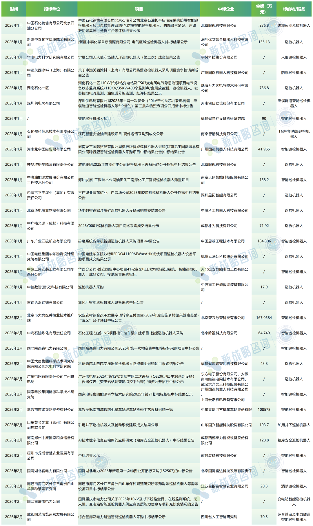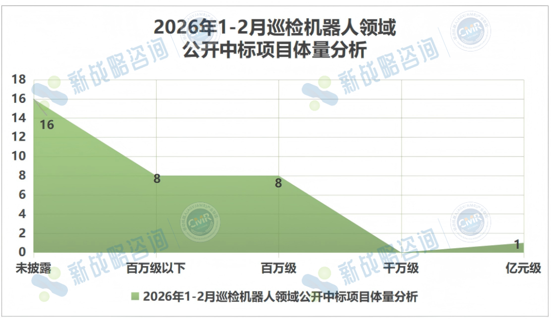 2026年的巡检机器人市场,以一份亮眼的成绩单开局。根据CMR产业联盟、新战略移动机器人产业研究所统计,1月全国巡检机器人中标19项,披露中标总金额约1713万元;2月全国巡检机器人中标14项,披露中标总金额约1.09亿元。两月合计披露33个项目,有效披露中标金额共计超1.1亿元。