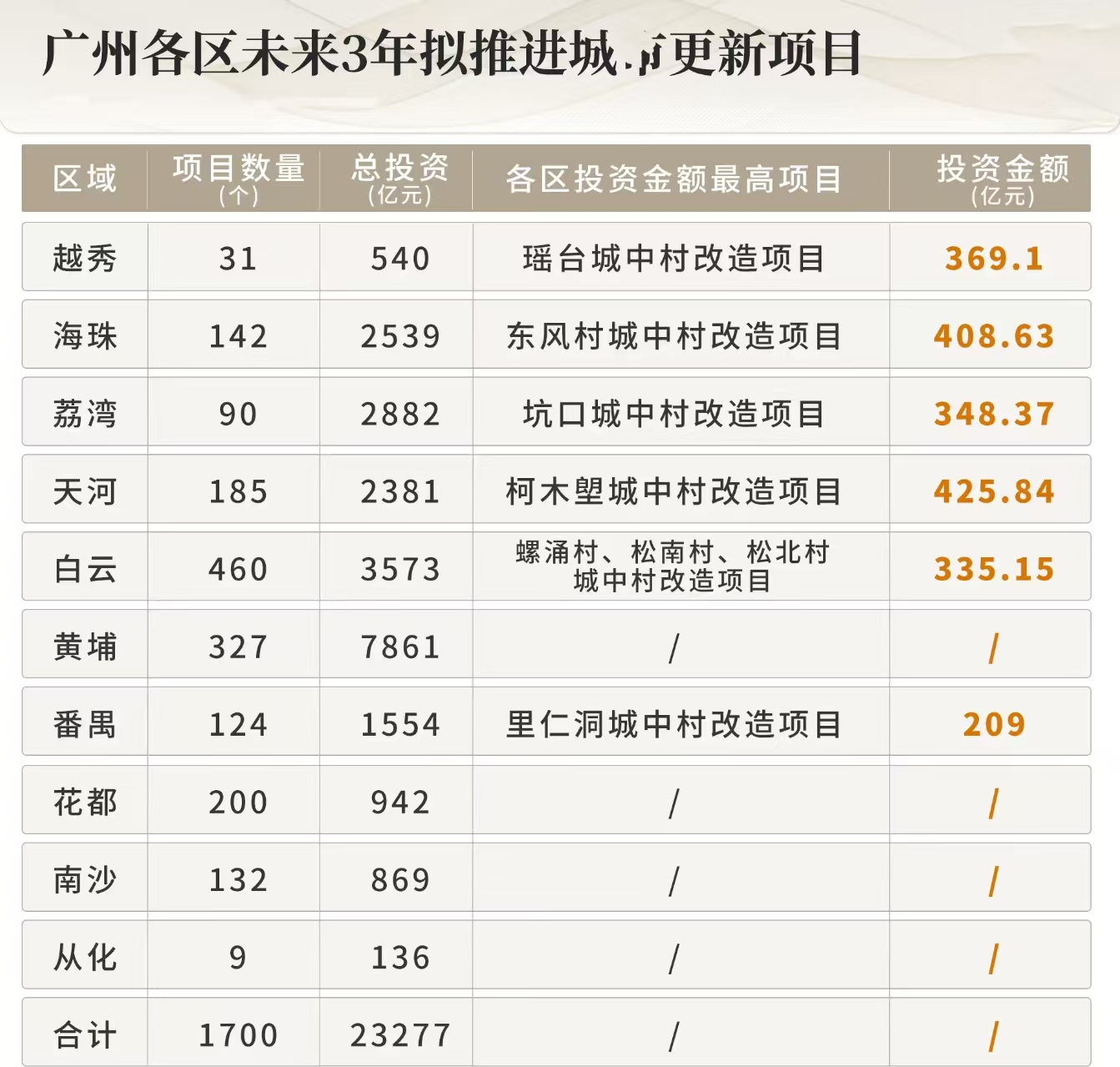 如果按照预期的改造进度,白云的旧改丰收期,很可能在2028-2029年集中到来。对比过往动辄8-10年改造时间,是明显缩短的。而我们也看到,白云在旧改上的决心和力度,比很多区都要大。根据去年底召开的广州城市更新发展大会暨项目推介会披露:未来3年,白云预计推进460个城市更新项目,拟投入3573亿元进行城中村改造。这个数额,比海珠、荔湾、天河都多,仅次于黄埔。换句话说,白云在未来几年,将是继黄埔后,又一个旧改“专业户”。2026年开年连发拆迁招标,正是在贯彻落地这个宏观目标。