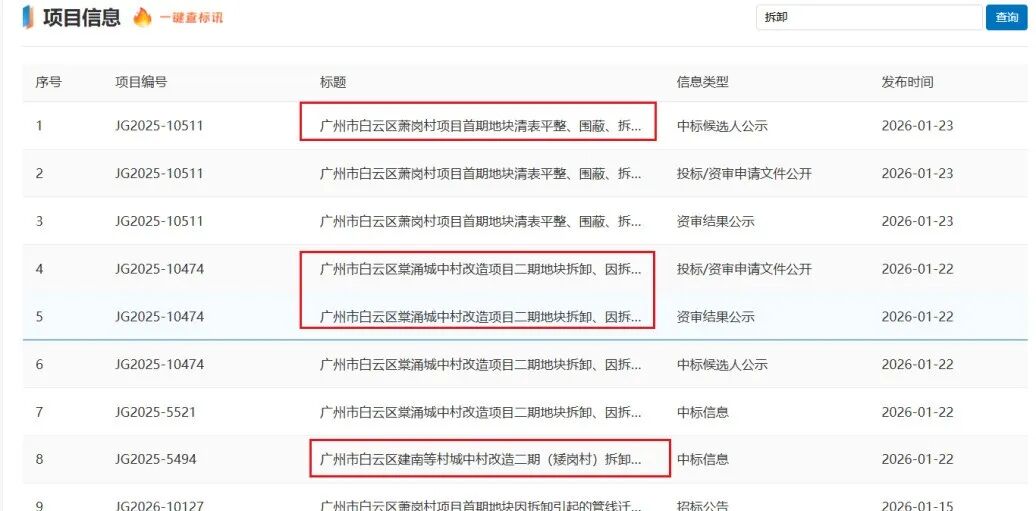 楼市君简单翻了下的官网,今年1月以来,全市进行围蔽、拆卸招标的城中村,几乎全都在白云。
