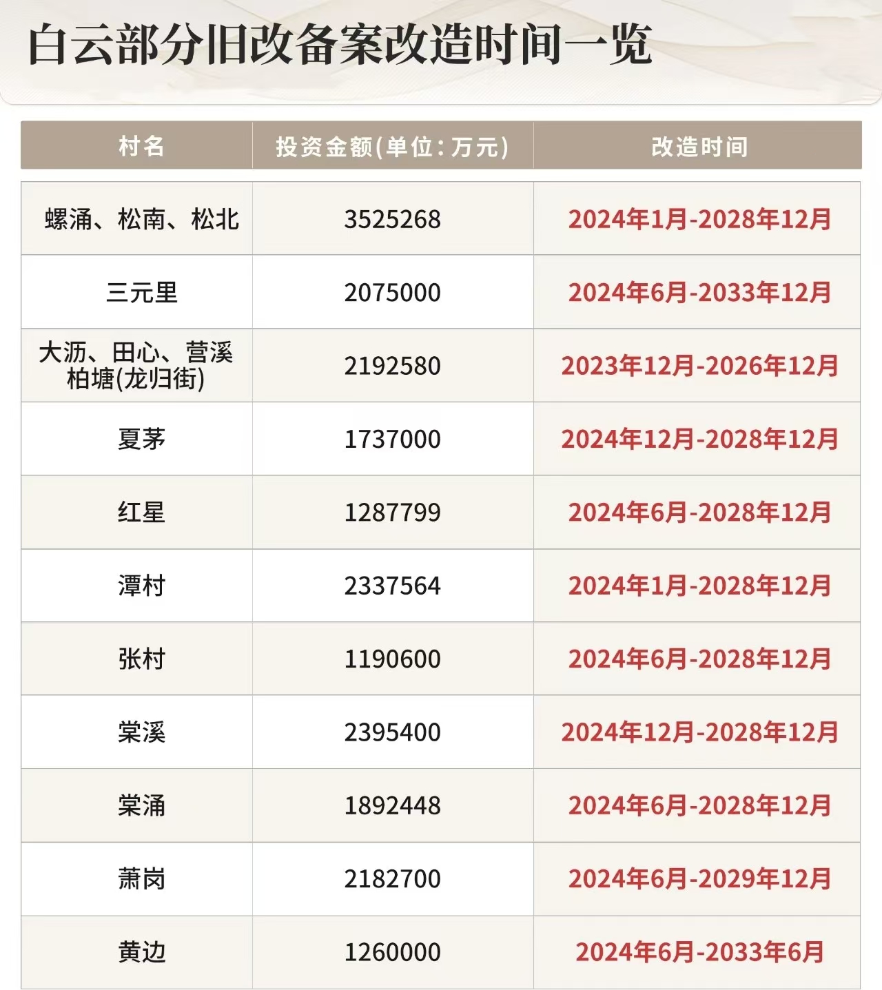 而且,白云好几个村,也是一踏入2026年,就准备进场开干。像巨无霸旧改棠涌村,今年准备开拆268万平私宅建筑;白云北部四镇的建南村,年内拆卸体量高达114.76万平。连之前一度遭遇“肠梗阻”的潭村,最近也在招标清拆。加上已经在拆的三元里、黄边、夏茅、罗冲围、陈田村等,今年白云预计有超过10个村,迈入拆卸时序。进行横向对照,相当于白云2023年之后备案的旧改,目前基本有实质性进展。