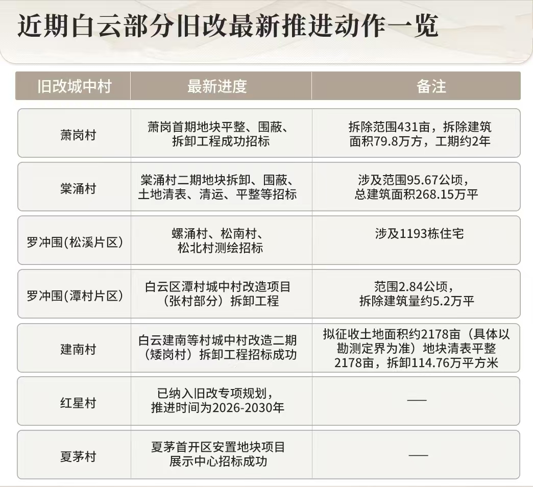 2026年第一个月,白云旧改就带头猛冲了。前天,白云萧岗旧改首期拆卸工程招标成功,79万方建筑面积,预计2年拆完。楼市君