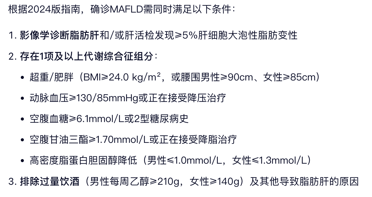 而脂肪肝的确诊,需要同时满足三个核心标准:影像学或肝活检发现≥5%的肝细胞脂肪变性;存在至少1项代谢综合征组分;排除过量饮酒和药物、肝豆状核变性等其他可导致脂肪肝的原因。
