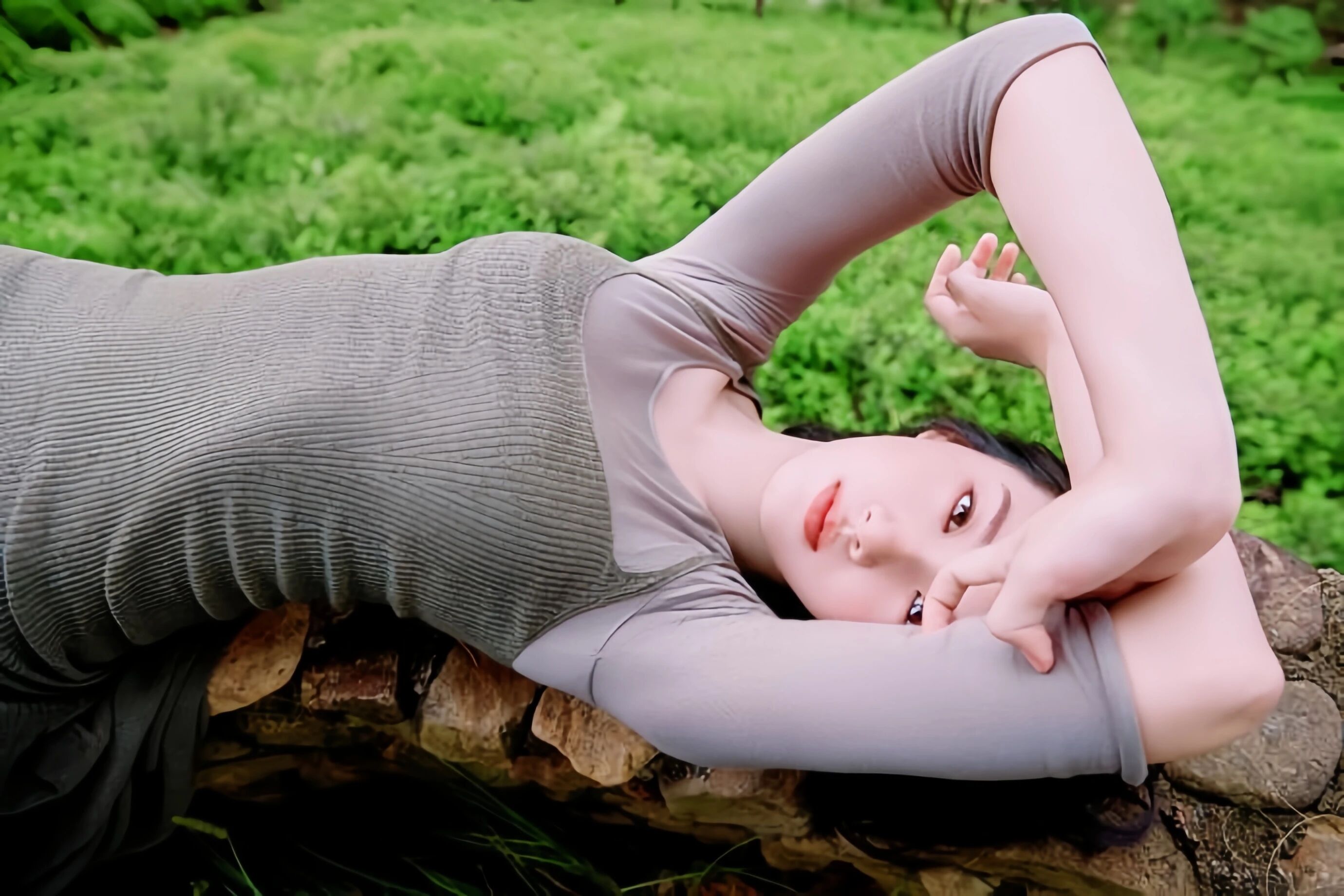 她穿一件灰调的长裙,料子软得像山间的云,贴在腰身上勾勒出柔和的曲线。不是紧绷的性感,是松弛的、带着烟火气的好看。就像我们在乡下外婆家见过的邻家姐姐,随手摘片大叶子挡太阳,指尖划过叶边的弧度,都带着点漫不经心的撩拨。