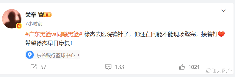 据关辛的报道,徐杰在昨晚受伤后直接前往了医院进行缝针,他的眉骨被缝了3针,处理完伤口后徐杰还在问能不能接着回去打。
