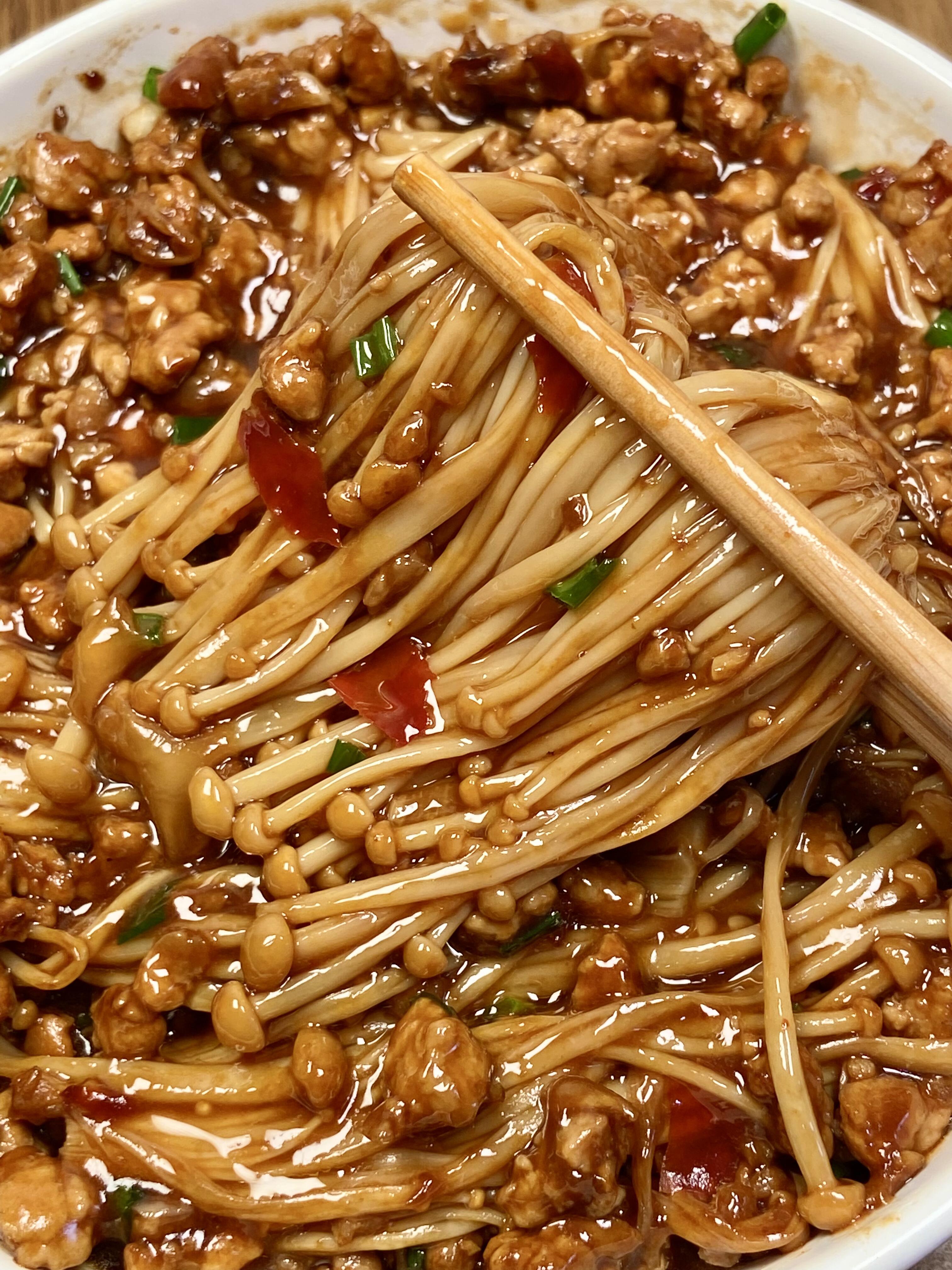 2. 肉沫不要炒太久,变色断生就可以先盛出来,最后回锅只是让它和金针菇融合味道,这样肉质才会保持嫩滑。