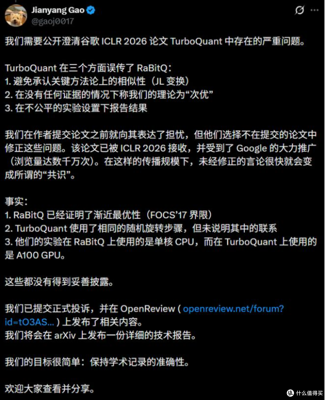 面对实锤指控,谷歌 TurboQuant 第一作者 Amir Zandieh 仅简单回复:“随机旋转和 JL 变换已是领域标准技术,不可能引用每一个相关方法”。