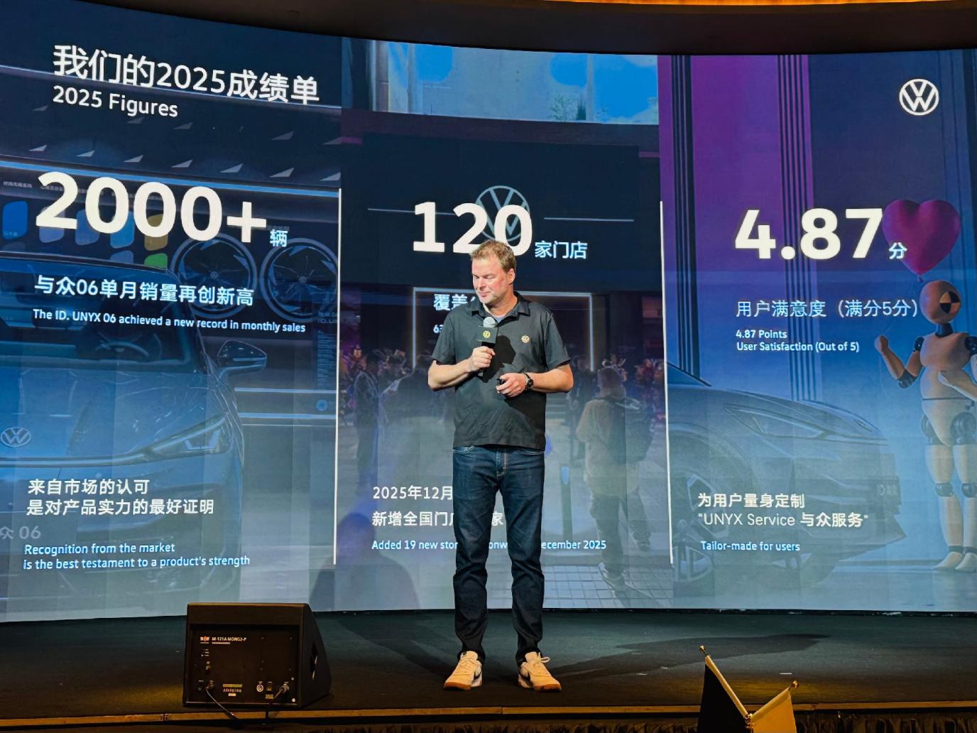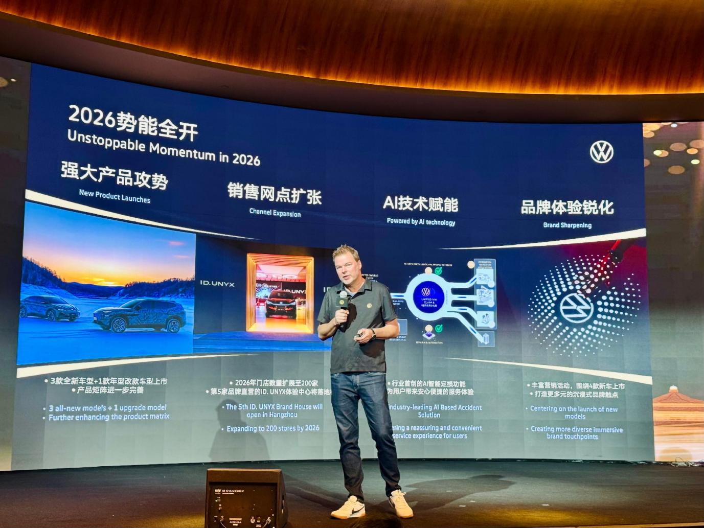 2026 年,金标大众全面发力。今年将推 4 款新车,3 款全新(首款纯电轿车与众 07、全尺寸 SUV 与众 08、一款待揭晓轿车),1 款改款(2026 款与众 06)。销售网点持续扩张并下沉三四线城市,计划达 200 家,第 5 家 ID. UNYX 体验中心今年落地杭州。