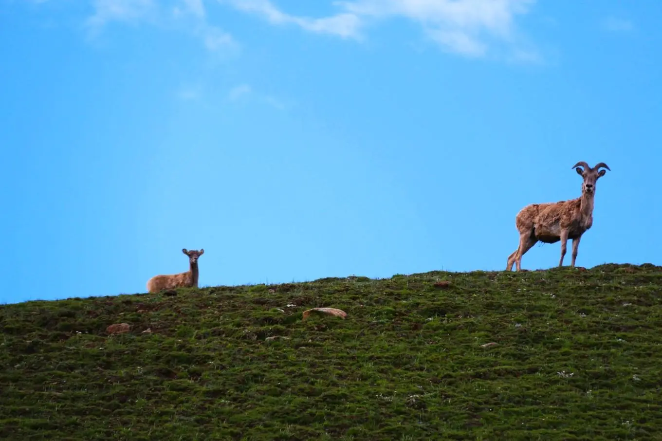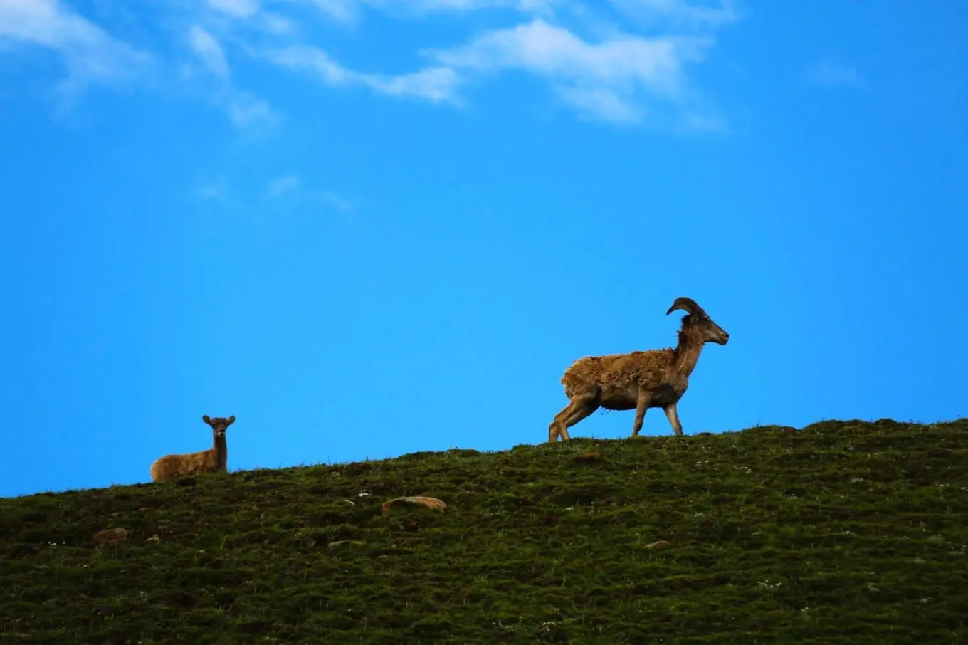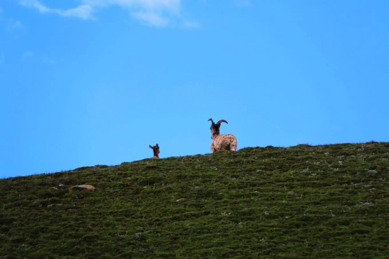 当我们正准备离开的时候,一对母子从河谷跑了上来,一前一后翻过道路冲上山坡,消失在山梁之后的蓝天里面。