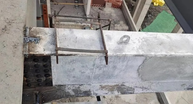 应用样板钢梁在产品性能方面,MPC防腐防火一体化材料表现突出:3h抗压强度≥0.82MPa,初始流动度≥240mm,导热系数低至0.01988,28天防腐性能与环氧涂料相当,各项指标均达到行业领先水平。同时,该材料还具备三大显著特点:一是凝结硬化速度可控,5~30分钟可实现快速凝固,适配不同施工场景需求;二是与基材粘结性优良,与钢材1天粘结强度≥0.2MPa,不易脱落、开裂;三是施工工艺简便,可采用预制防火板贴敷和喷涂两种施工模式,无需分别进行防腐、防火两道工序,有效减少钢结构施工流程,大幅节约工期,降低施工成本。