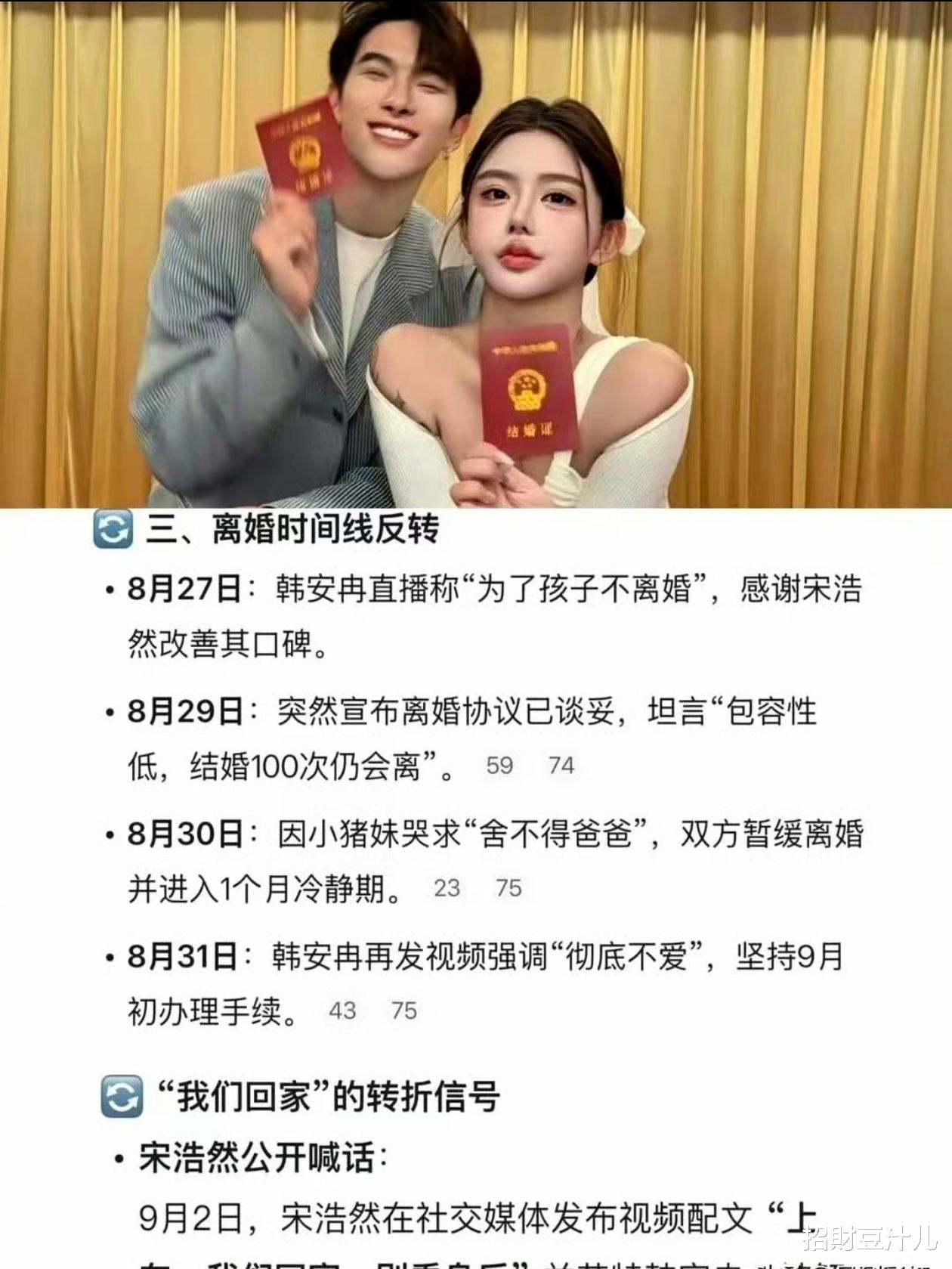 经济方面的问题也让他们的婚姻雪上加霜。宋浩然的公司连续四个月亏损,每月亏超20万,互联网对他来说成了“财务黑洞”。他甚至在直播中表示可以随时放弃互联网事业,可韩安冉却背负着1500万房贷和两个孩子的养育重担,她根本没办法轻易放弃。两人对事业截然不同的态度,让矛盾进一步激化。宋浩然那句“我随时能放下互联网这碗饭,但韩安冉未必舍得”,直接成了压垮他们婚姻的最后一根稻草。
