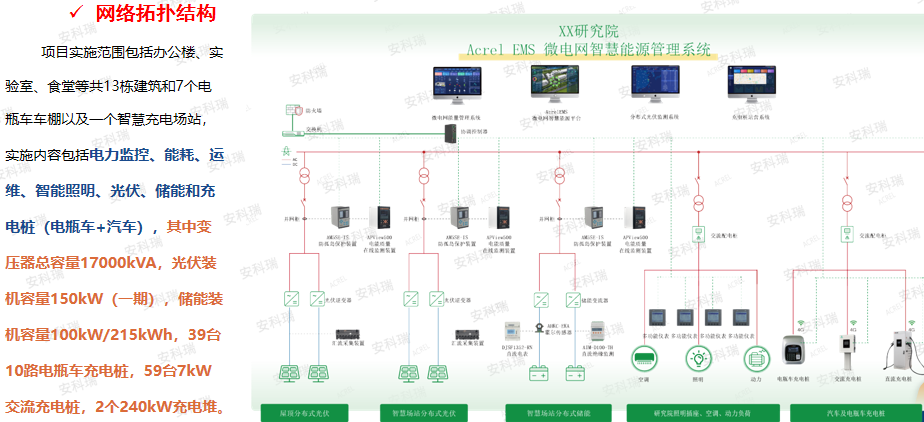 项目背景:该研究院最早建设于2008年左右,随着不断扩建新建园区,早期供配电数据和新建供配电差异极大,研究院希望建立园区级微电网智慧能源管理平台,实现各项能源的集中化管理,深入分析能源消耗过程与趋势,同时为企业和员工提供充电服务,利用光伏和储能降低用电成本,实现能源管理与工商业生产紧密结合。
