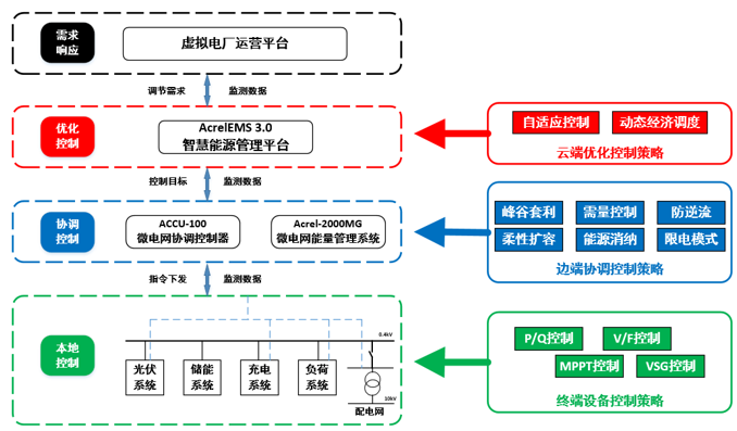 对微电网的源、网、荷、储能系统、充电负荷进行实时监控、诊断告警、全景分析、有序管理和高级控制,满足微电网运行监视全面化、安全分析智能化、调整控制前瞻化、全景分析动态化的需求,完成不同目标下光储充资源之间的灵活互动与经济优化运行,实现能源效益、经济效益和环境效益最大化。