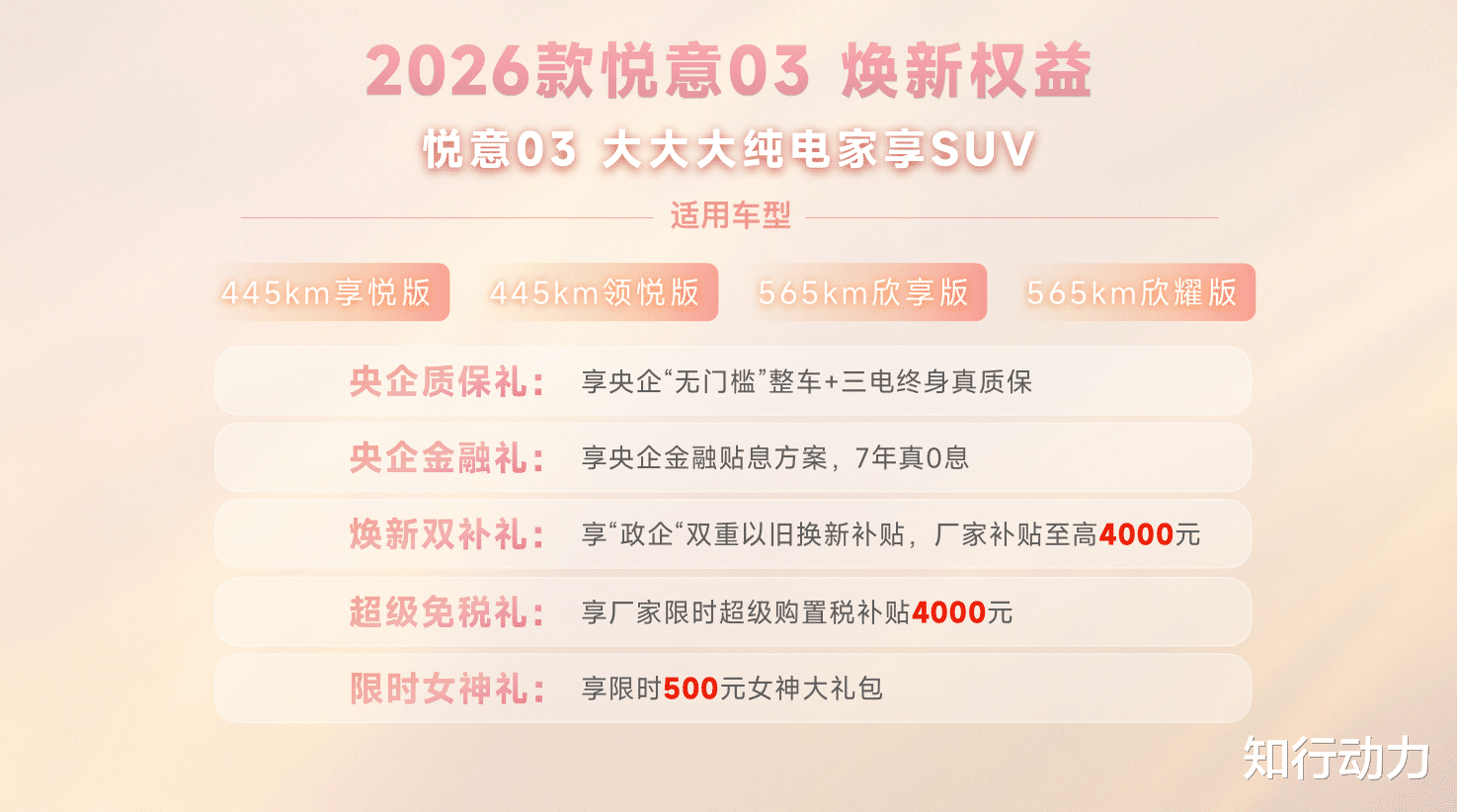 2026款悦意03还重磅推出央企五重礼遇。购车即享央企质保礼,“无门槛”整车及三电终身质保;更有7年真0息央企金融礼,极大降低拥车门槛;同时,新车叠加焕新双补礼,政企双重以旧换新补贴至高4000元;以及限时4000元购置税补贴的超级免税礼;限时500元的开学/开工礼。
