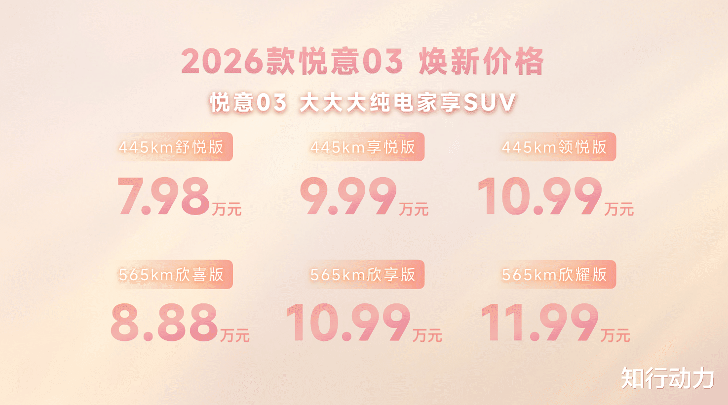 3月8日,2026款悦意03正式上市,新车共推出6款车型,指导价为7.98-11.99万元,该车定位为紧凑型SUV。