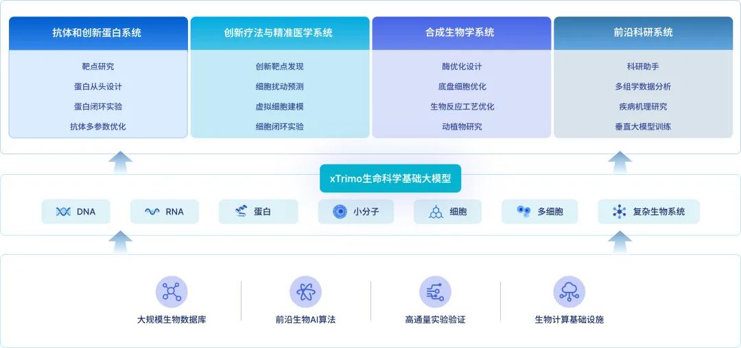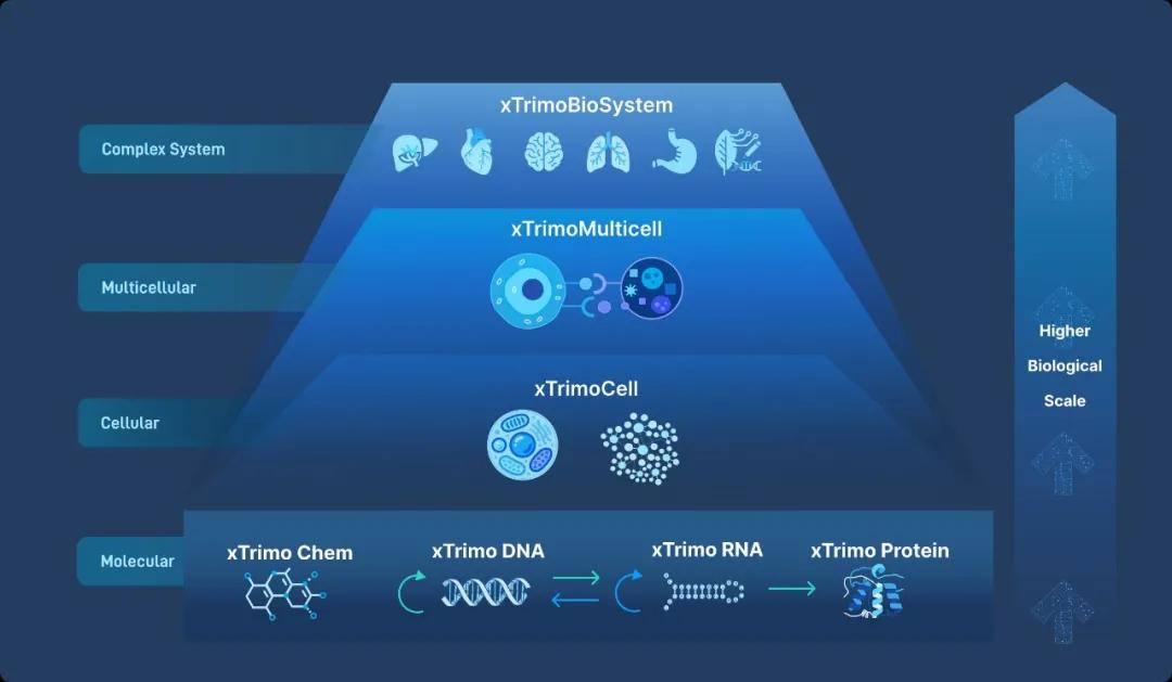 xTrimo 是百图生科自研的科学基础大模型,针对 DNA、RNA、蛋白质、细胞等多个关键生物模态,提供统一的高维表征与跨模态建模能力,实现从生命生物分子、细胞、组织器官到个体表型等不同层次的理解和预测。