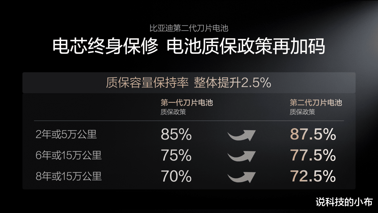 那么这么快的充电速度会不会影响电池寿命呢?答案可能会让你感到不可思议,第二代刀片电池的寿命比第一代刀片电池还要长。作为电池起家的比亚迪,在做电池这块确实是有点东西的。我们知道大功率往往会在短时间内产生大量容量从而对电池寿命产生影响,而第二代刀片电池通过打造“锂离子高速通道”和“全温域智能热管理系统”,让闪充时少产热,并且让热量更快、更均匀地散出去。正因为这份底气,比亚迪第二代刀片电池质保政策再加码。第一代刀片电池的时候,6年或15万公里内电池容量低于75%免费包换,第二代刀片电池提升2.5%,6年或15万公里内电池容量低于77.5%免费包换。如果闪充真的影响电池寿命,比亚迪也不敢做出这样的承诺。