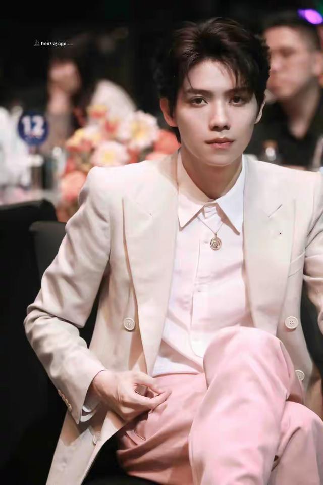 现代装扮下他是高冷自持的帅气男生,一身粉白色的西装衬得他格外白皙俊美,就像是富贵人家中不爱说话的高冷二少爷。