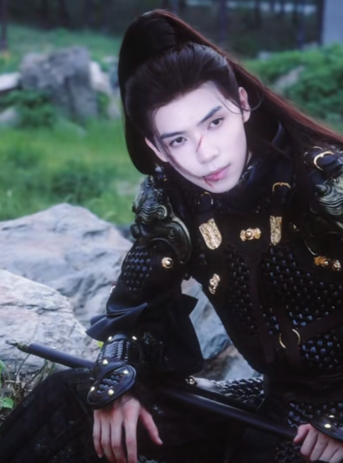 身材优越、面容俊美,颇有种拼死奋战,得胜归来掩盖不住弑杀气息的少年将军模样。