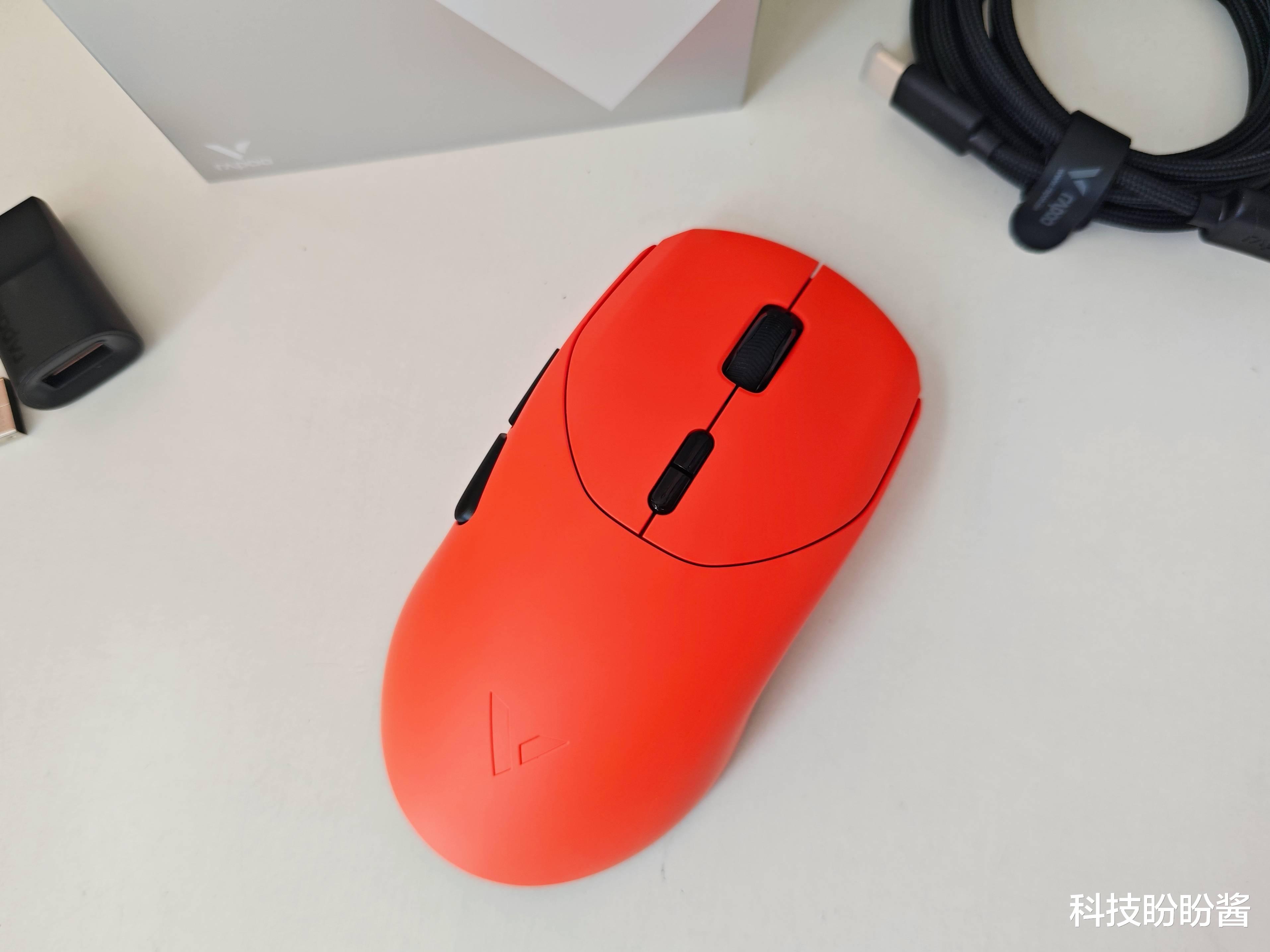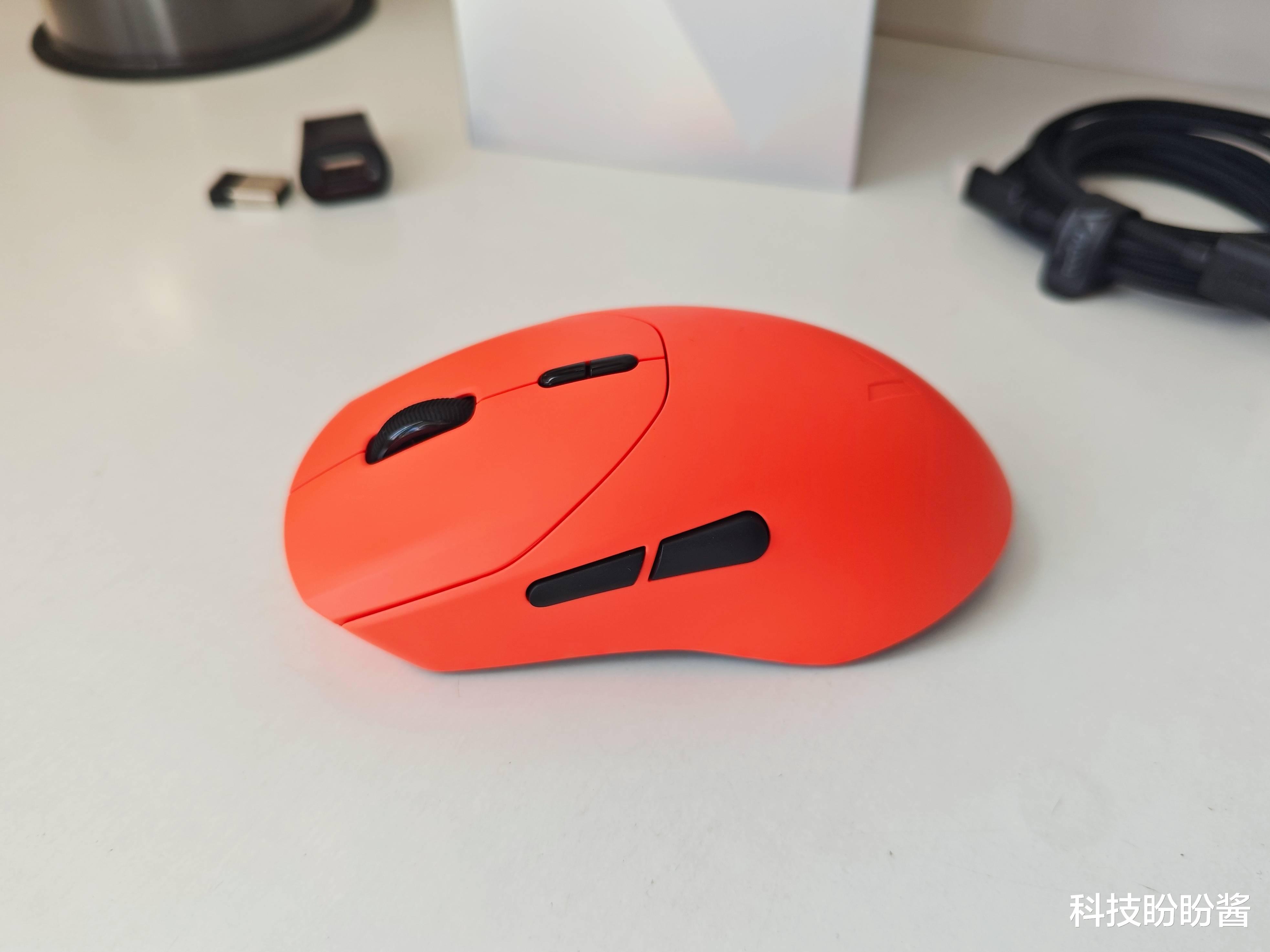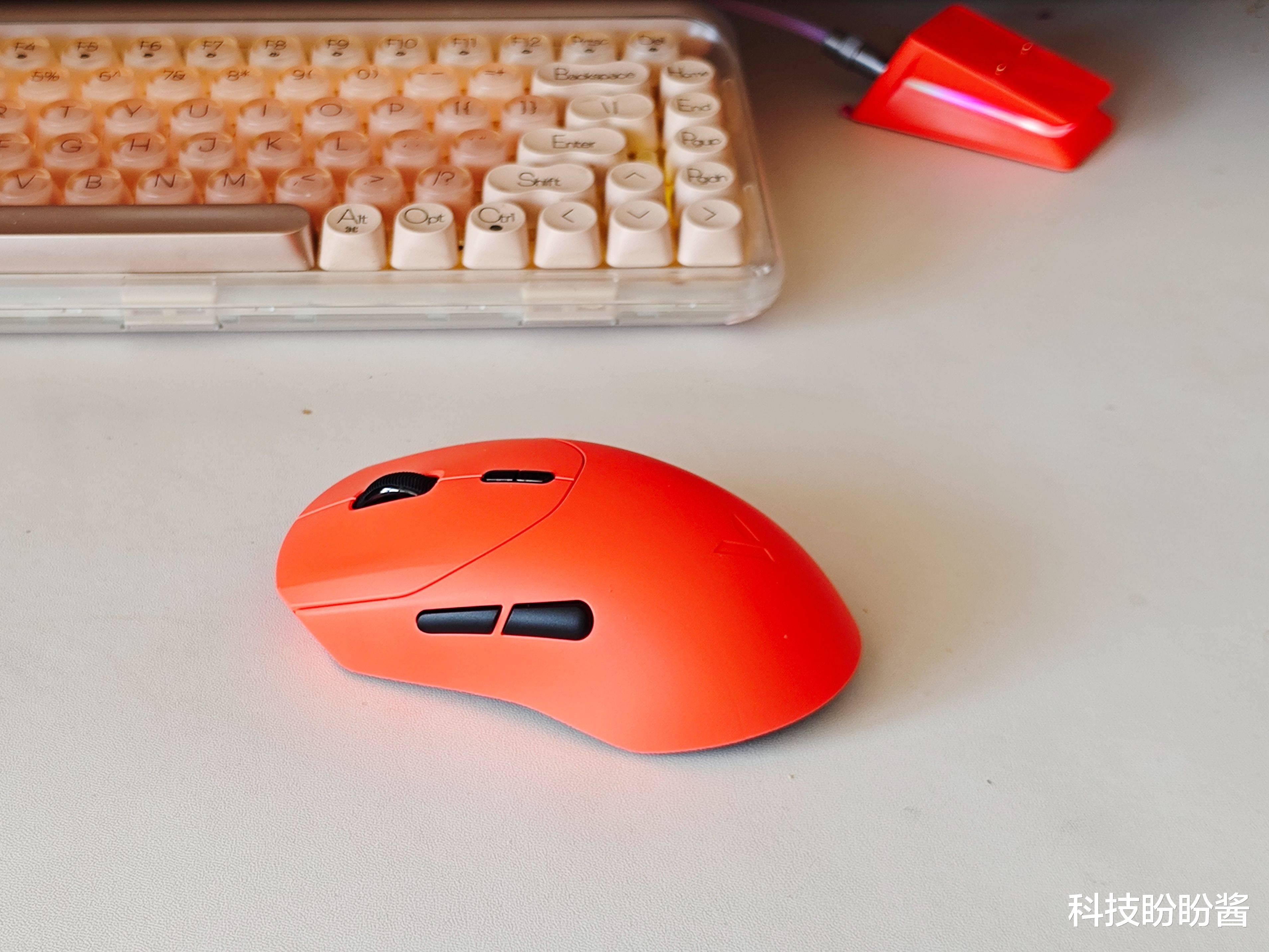 颜值这块真的没话说,焰影橙饱和度刚刚好,亮眼却不刺眼,放在桌面上瞬间提升氛围感。鼠标是右手对称设计,中大手型握起来都很贴合,虽然机身不算迷你,但重量控制得特别出色,仅53g左右,拿在手里轻盈无负担,长时间玩游戏也不会觉得手腕累。