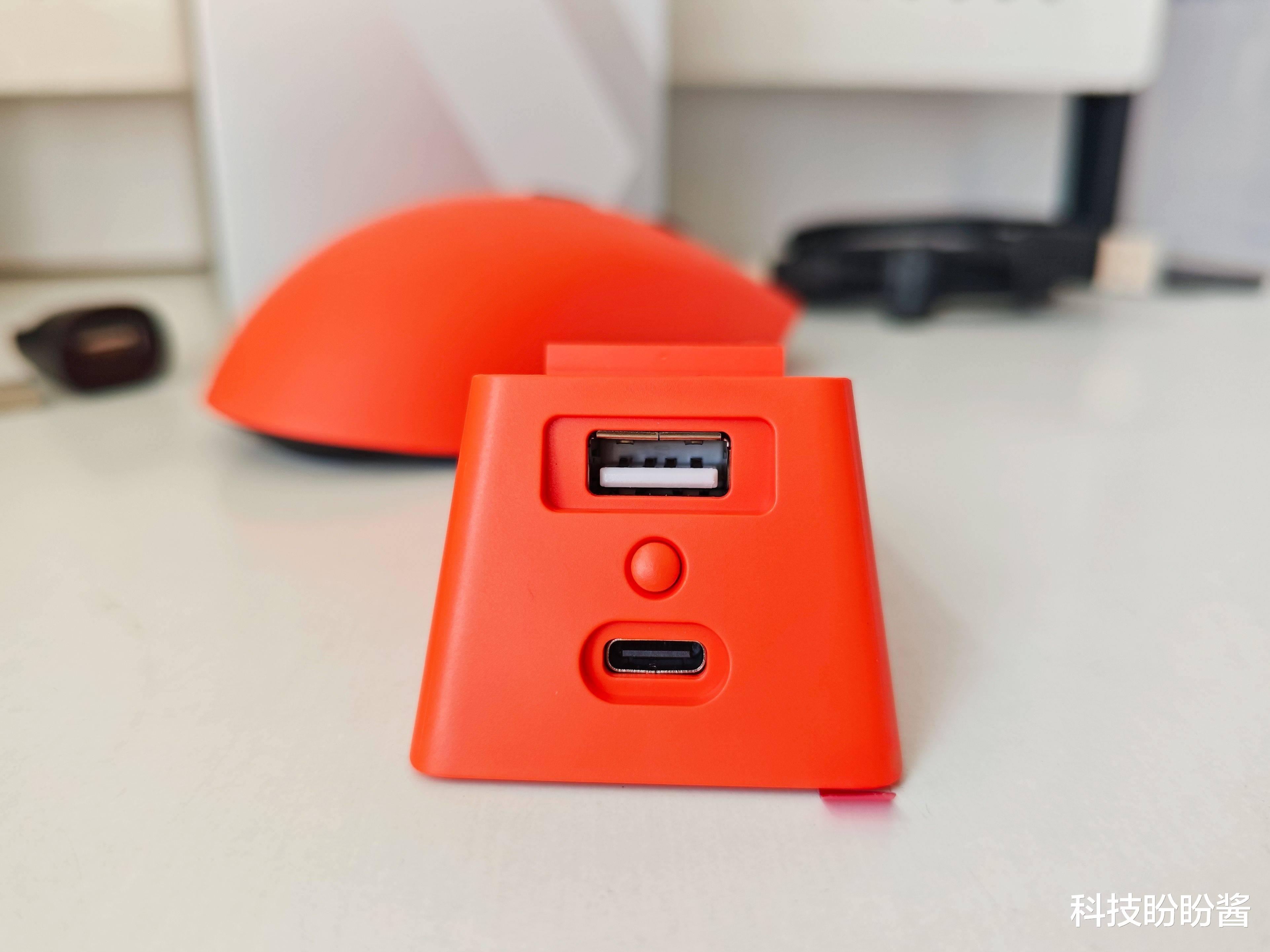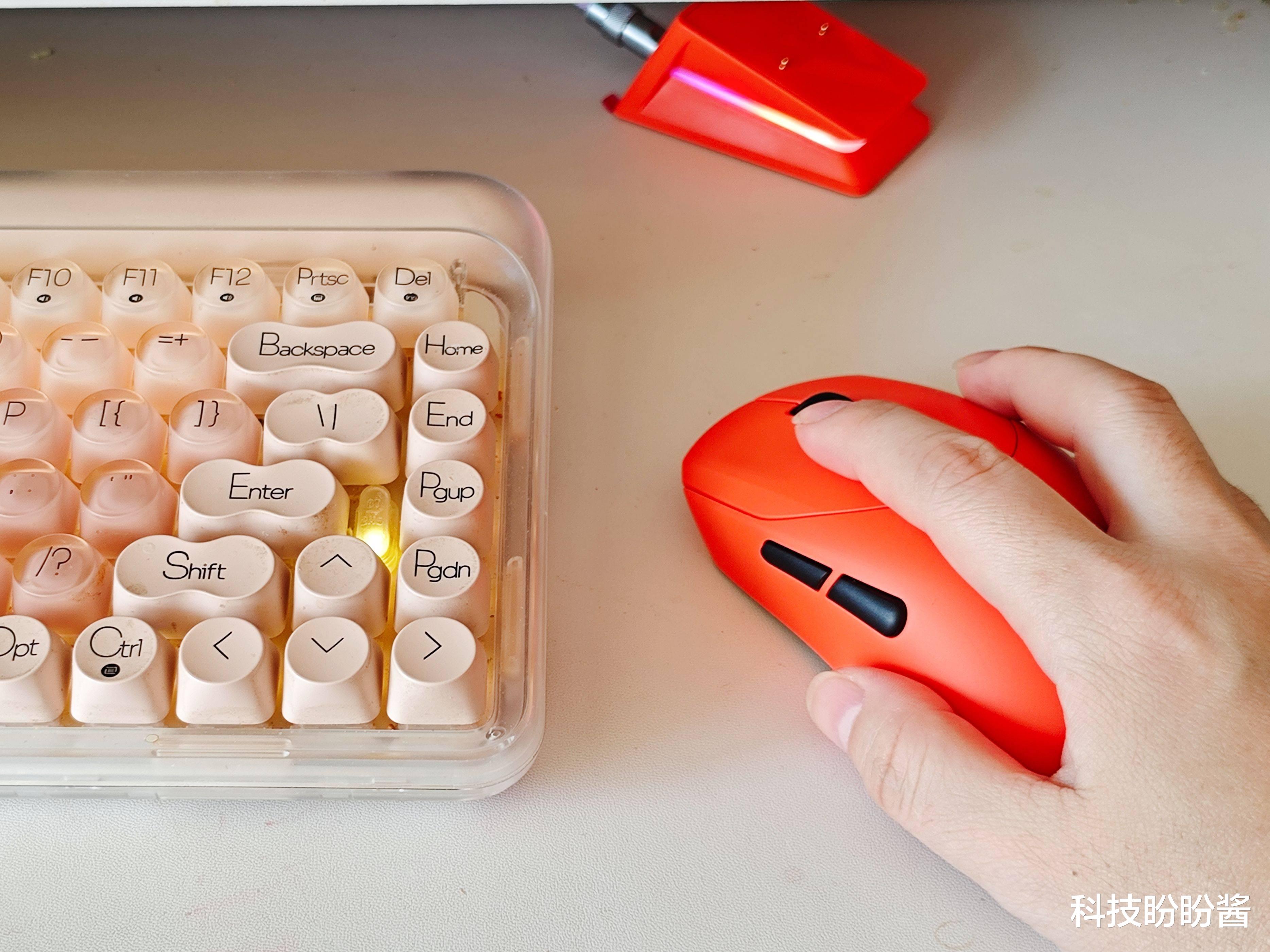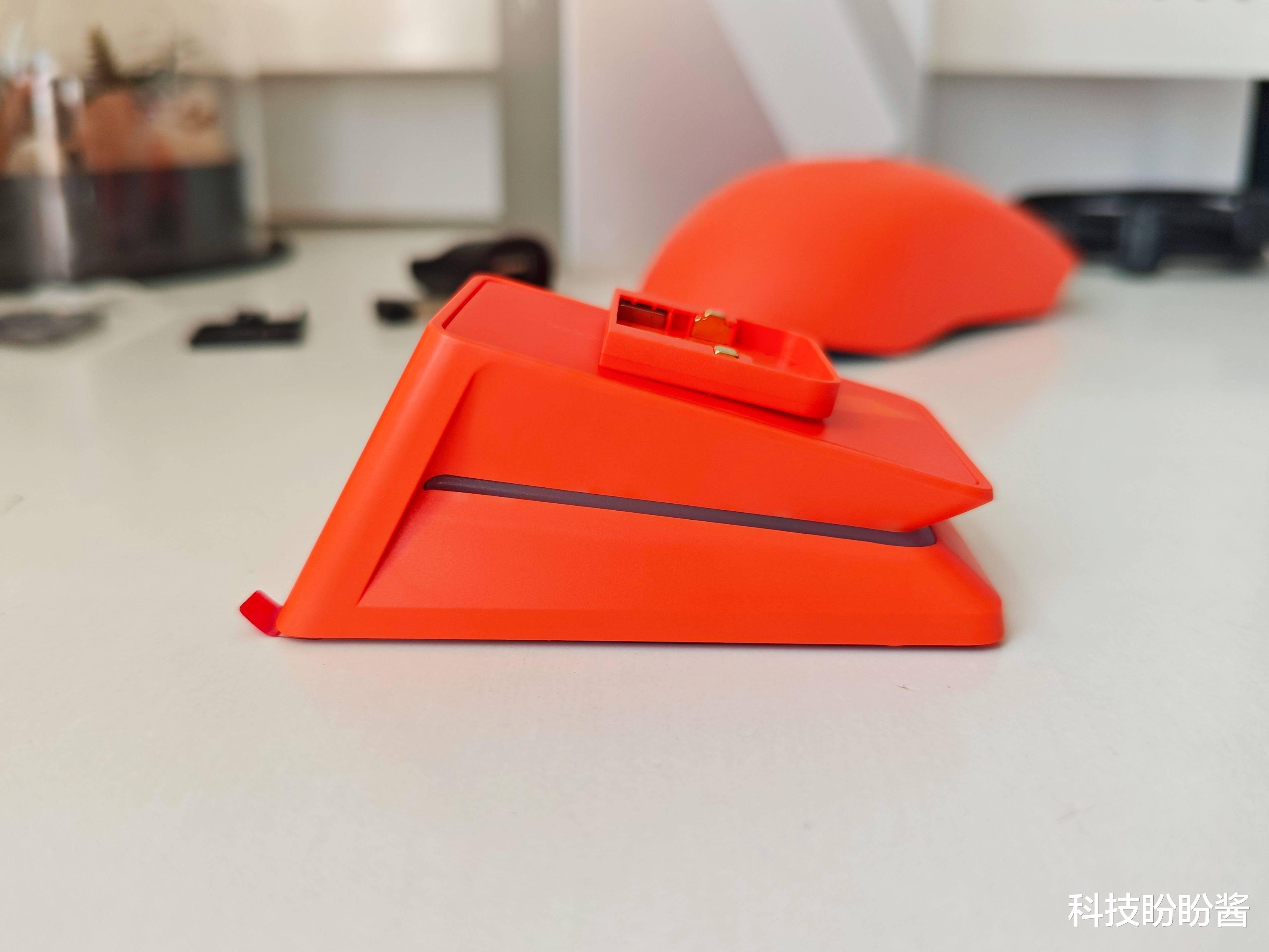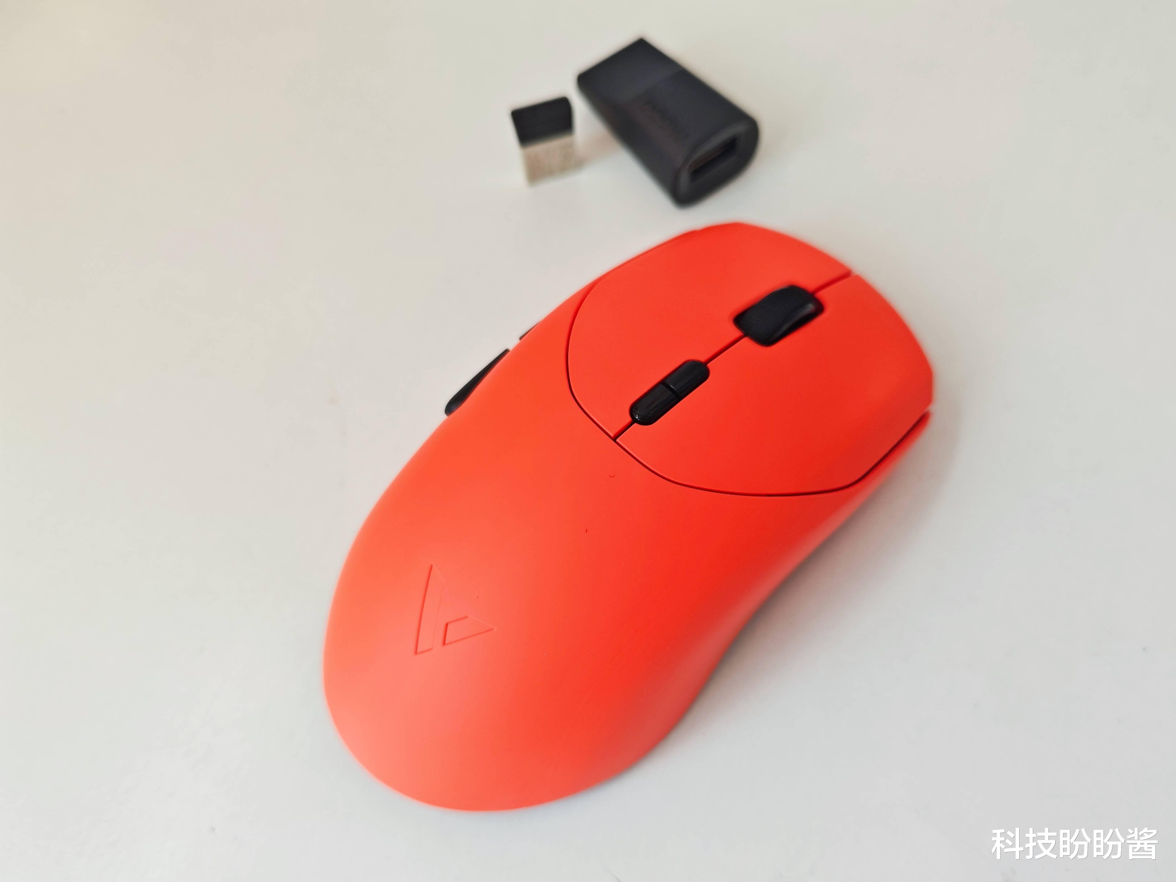 颜值这块真的没话说,焰影橙饱和度刚刚好,亮眼却不刺眼,放在桌面上瞬间提升氛围感。鼠标是右手对称设计,中大手型握起来都很贴合,虽然机身不算迷你,但重量控制得特别出色,仅53g左右,拿在手里轻盈无负担,长时间玩游戏也不会觉得手腕累。