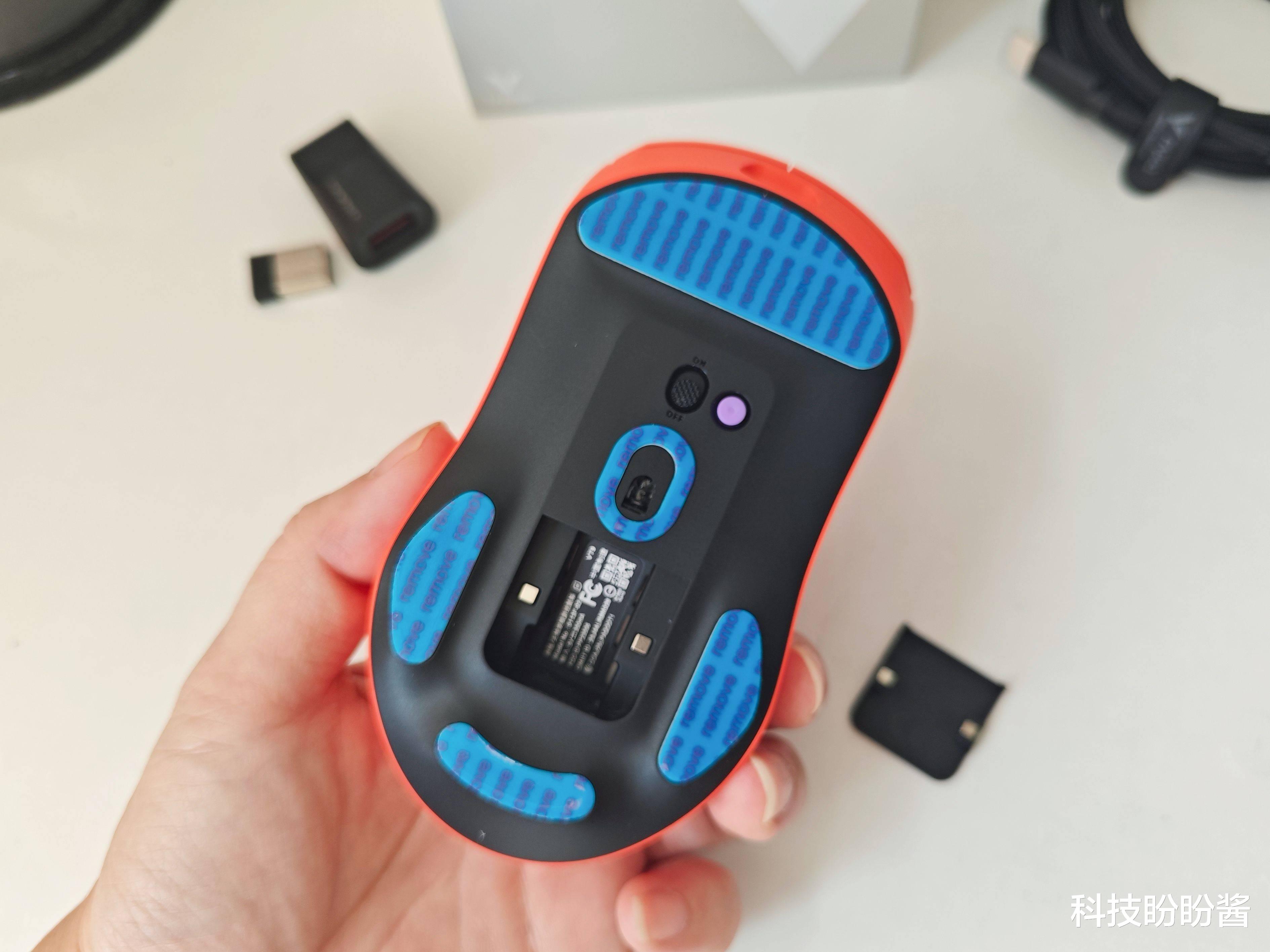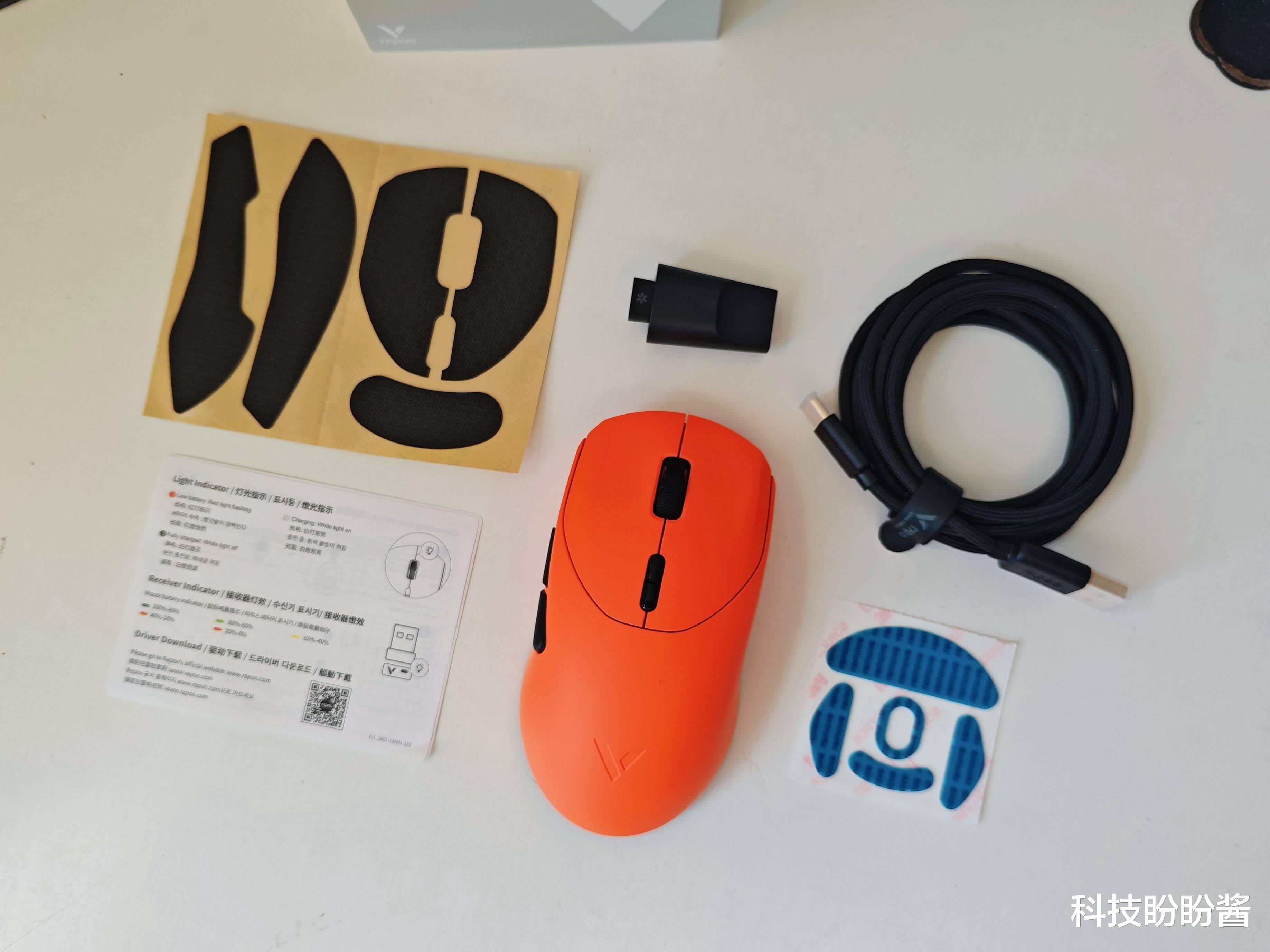 开箱的第一感觉就很有质感,幻彩包装在光线下很有氛围感,正面清晰标注着品牌、型号和核心参数,配件也给得很齐全:鼠标本体、8K高速传输数据线、USB转接器、Nano接收器(带有电量指示灯),还有备用脚贴、按键防滑贴和说明书,到手就能直接用,不用额外准备配件。