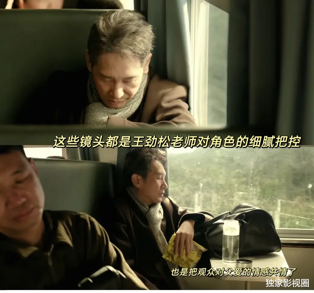 比如,王劲松采访中说将自己对父亲的思念完全注入了孟思远这个角色。他青年时从徐州到南京求学,需要辗转7小时火车加渡轮,父亲送行时“汗津津拎换季被褥,喝口水就走”的真实记忆,成了他表演的灵感。泡面和老干部玻璃水杯,都是他的思路。因此,我们才能看到那个在绿皮火车上疲惫地,默默吃泡面的孟思远,这种才能被叫做生活化表演。