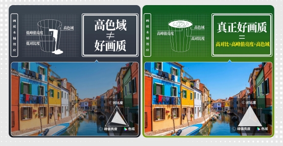 好画质不是单纯“颜色艳”,而是“看起来真”——能还原真实世界的层次与光影。而真正通透的画质,离不开“画质铁三角”:高对比度、高峰值亮度、高色域。RGB-Mini LED 更侧重色域表现,而则是三者兼顾,尤其是对比度和亮度优势明显。