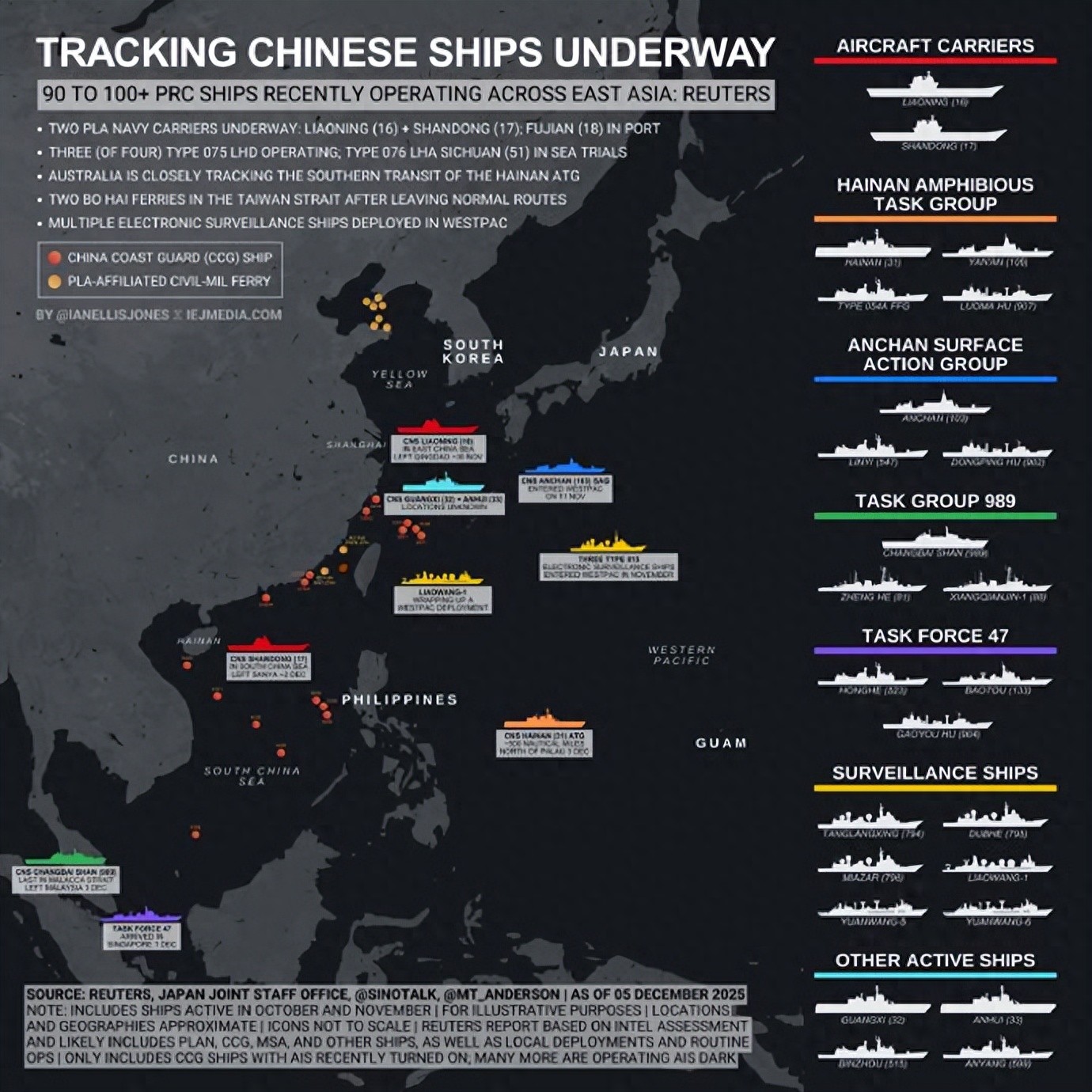 最近日本共同社报道称,中国在东亚海域部署100艘舰船军演。报道提到,确认到的情况是中方一度部署超过100艘舰船,12 月4日的情况是90艘舰船以上,范围遍布黄海、东海、南海以及西太平洋,日本和台当局对此反应强烈。日本防卫相小泉进次郎表示,正高度关注中方军事动向,而台当局则呼吁大陆保持克制。这俩反应这么大,无非就是对号入座了。过去这段时间,日本首相高市早苗发布错误涉台谈论,以“存亡危机”为由表示可能军事介入台海事务,而台当局则跟在后面恶心人。面对我海军这样的动向,他们当然做贼心虚了。