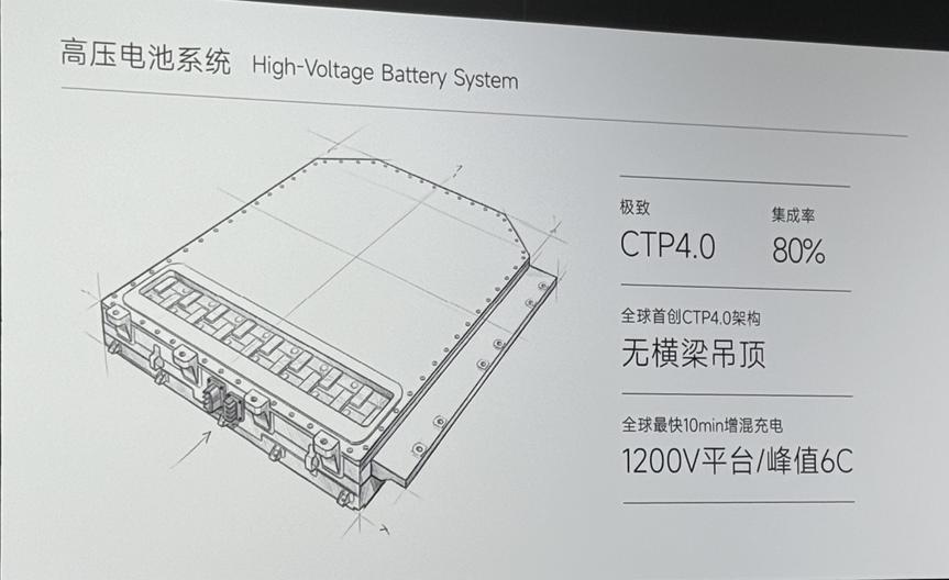 资料上写着几个核心参数:1200V 平台、峰值 6C 充电功率;CTP4.0 成组技术,集成率 80%。