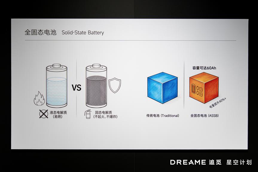二、星空天核固态电池在 AWE 追觅展台的一个角落,还躺着一块不起眼的电池包。关注到它的人并不多,但内行人看到,大概都会多看两眼。因为上面写着五个字:全固态电池。