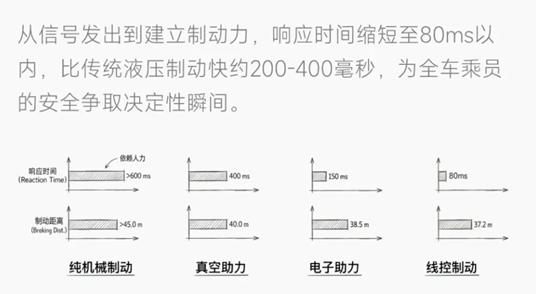 它最大的特点是响应更快。传统液压制动需要建立油压,而 EMB 可以直接通过电机驱动,响应时间能缩短数百毫秒。换算成真实驾驶场景,从驾驶员发现危险到车辆完成制动,相当于多出了几米甚至十几米的安全距离。同时,制动信号也从液压管路变成电子信号,整车布置更灵活,对整车架构会带来不少好处。