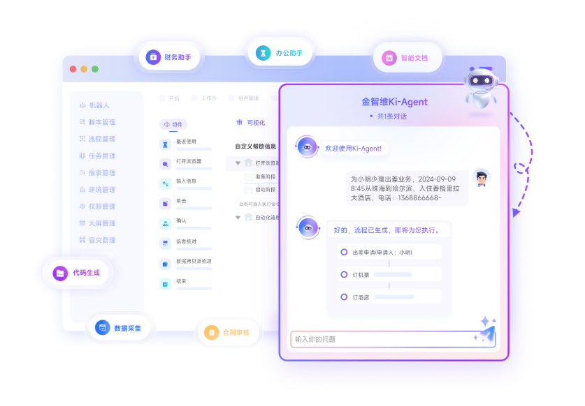 金智维凭借十余年自动化深耕与行业Know-How积累,推出Ki-AgentS企业级智能体平台,以Agentic AI架构为核心,构建灵活适配、全流程赋能的个性化落地解决方案。平台深度聚焦大模型的认知与规划能力,能够精准理解企业差异化业务目标、智能分解任务路径,实现目标驱动的全链路任务执行;同时支持将现有RPA工具一键导入为专属Agent工具,可自主组织多个Agent协同完成复杂业务场景,在企业内部快速组建高效协同的“数字员工”团队。