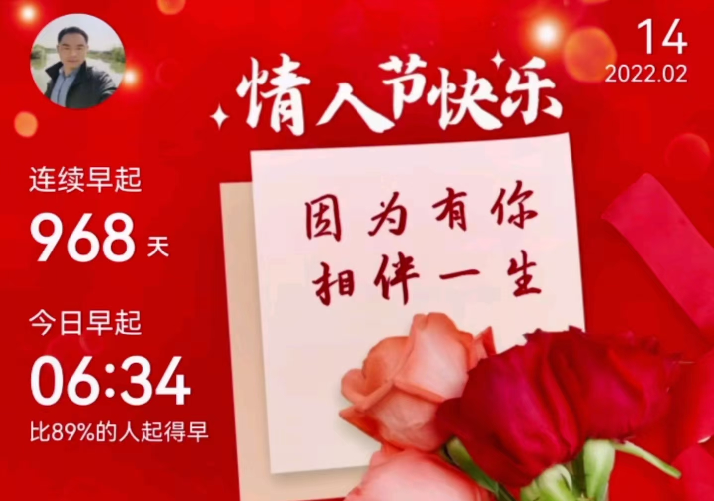 2022年2月14日的视频显示他已连续早起968天。