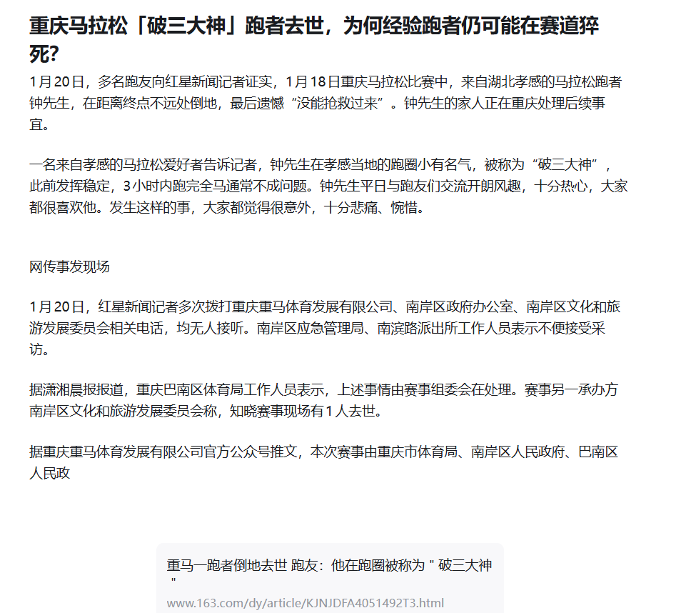 2026年重庆马拉松有一位破3大神在42公里处倒地不起,最终不治身亡,消息一出,跑圈震动,知乎有提问”重庆马拉松「破三大神」跑者去世,为何经验跑者仍可能在赛道猝死?”