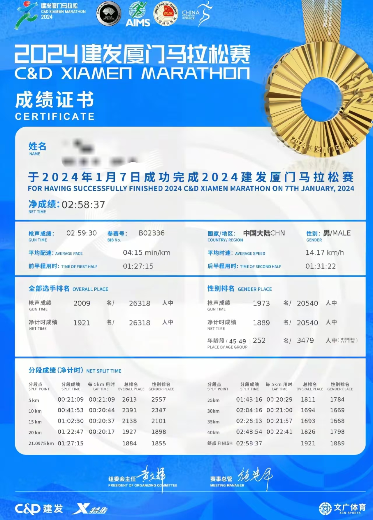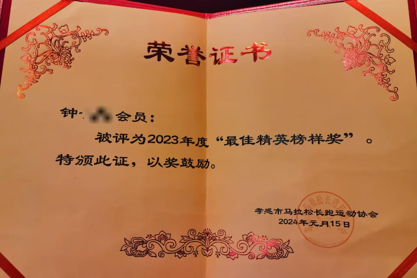 2024年,他在厦马实现破3,接着又被孝感跑协评为2023年最佳精英榜样。