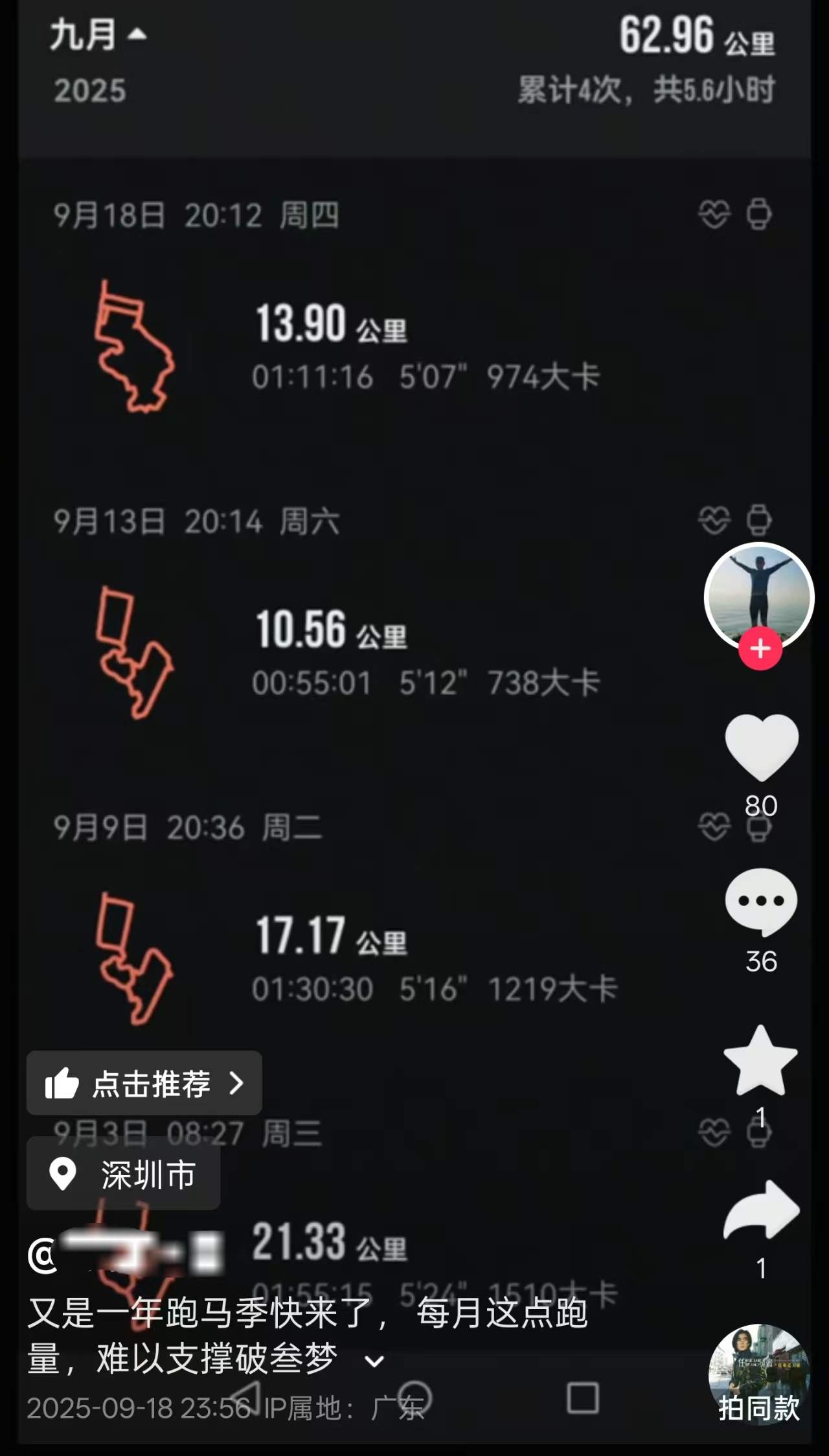 我在抖音找到了这位钟先生的主页,查看了一下他的视频,回顾了一下他的跑步之路: