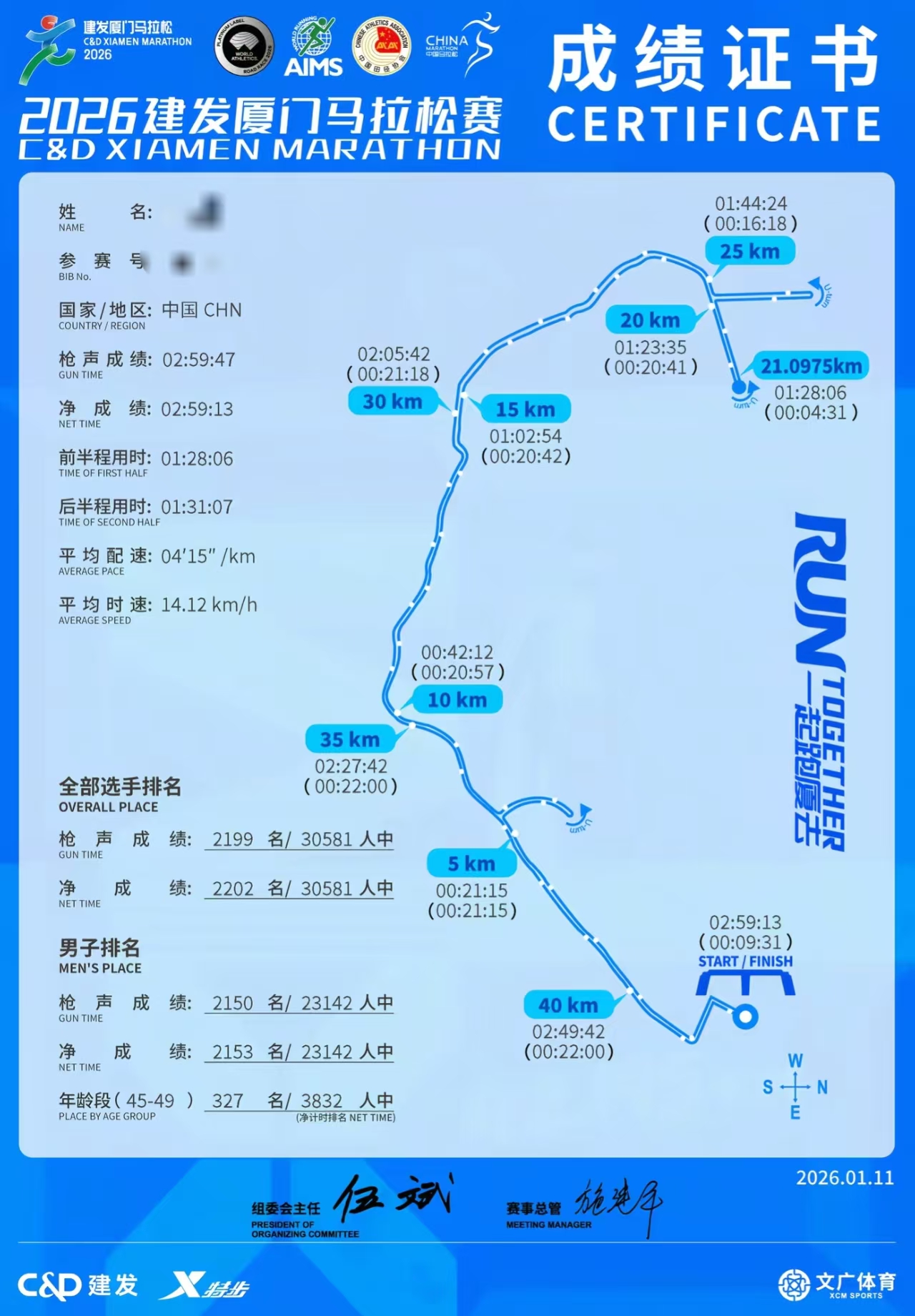 2026年1月11日厦门马拉松,他再次破3,成绩2小时59分,平均心率高达173。26厦门马拉松成绩证书显示他依然在45-49年龄组,年龄估计大概率在47-48之间。从11月南京马到1月重庆马,他八周六赛,五场全马。11-12月跑量估计增加不少,所以厦马再次破3。