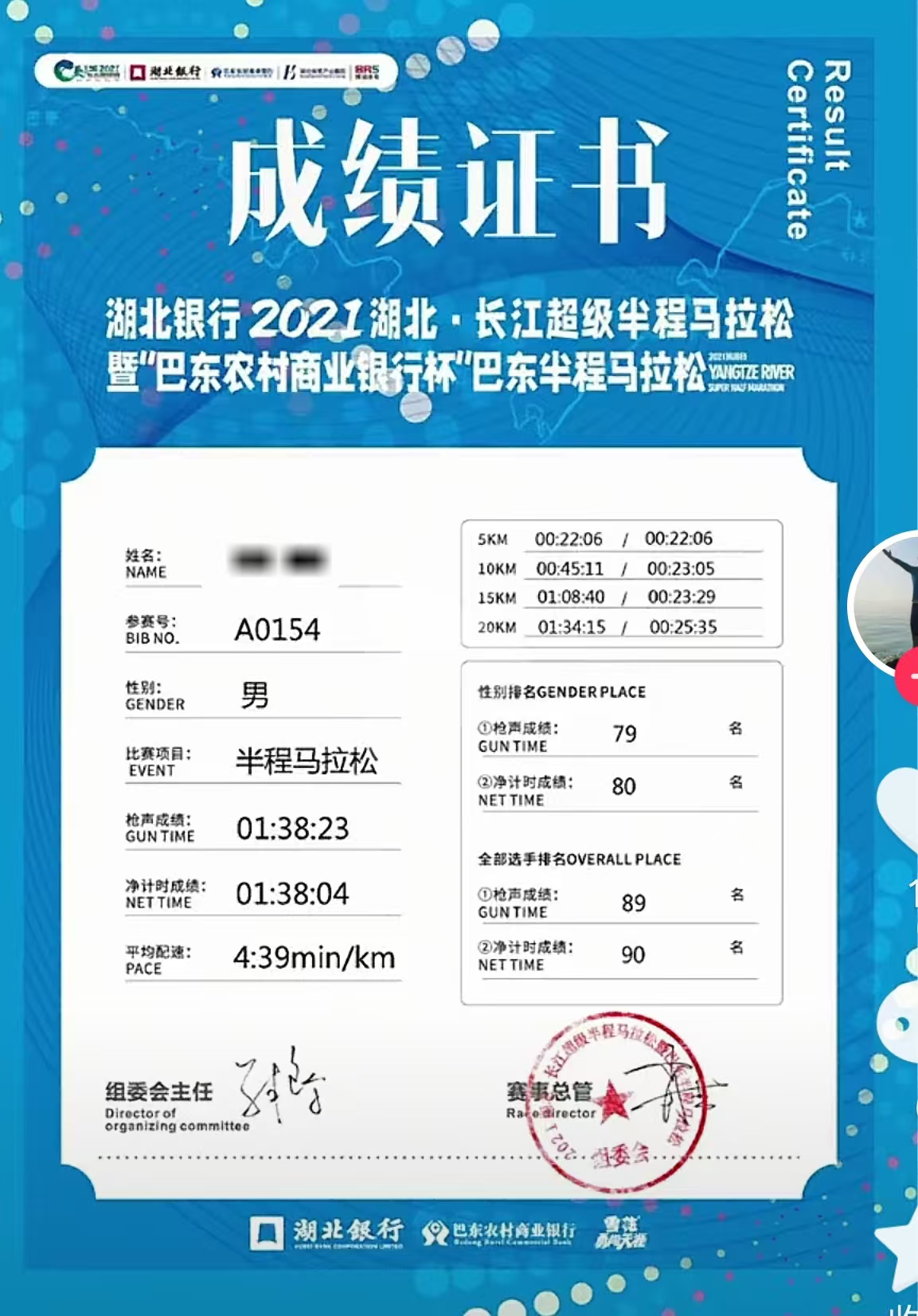2021年5月5日,他完成了自己的首半马——2021湖北·长江超级半程马拉松巴东站,成绩1小时38分4秒,净成绩排名全场90位。一周之后他又完成了一次全马距离跑步,用时3小时57分。