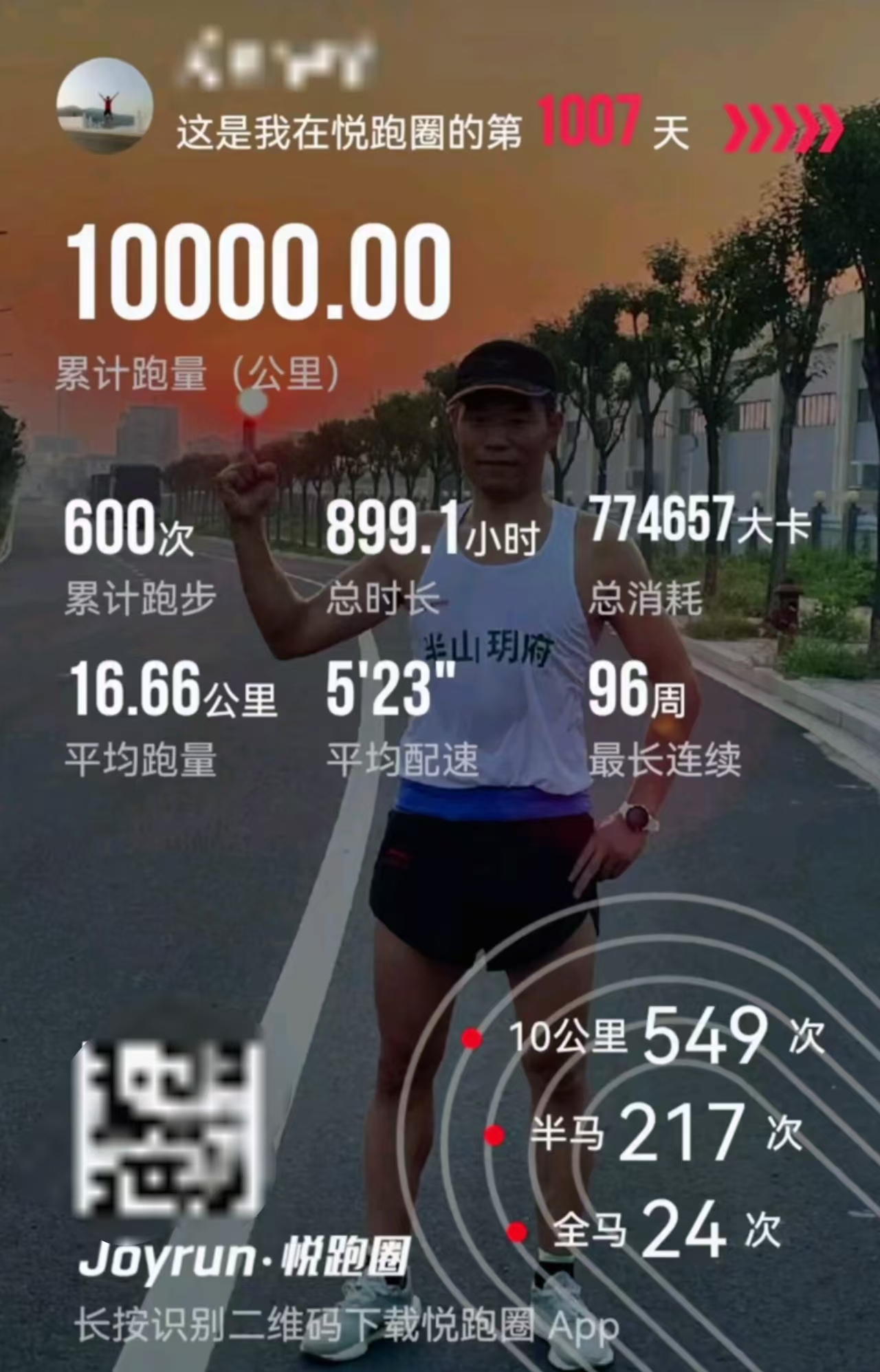 2023年3月,他在视频中晒出了总跑量7777.77公里的截图。