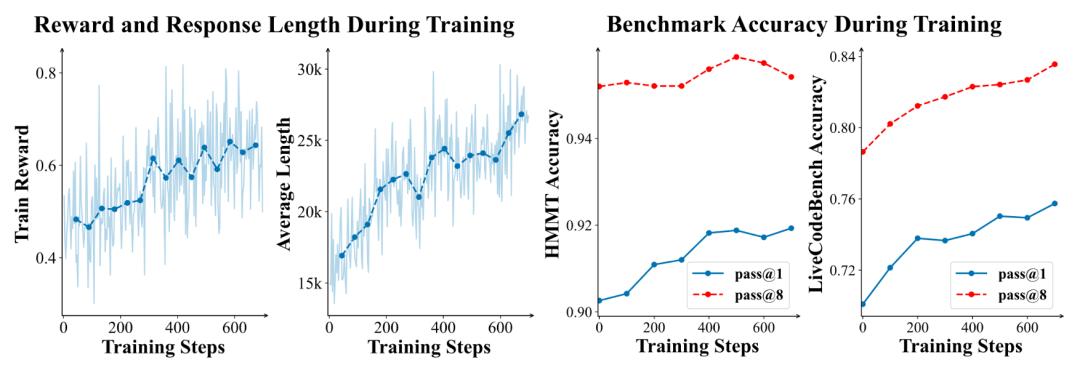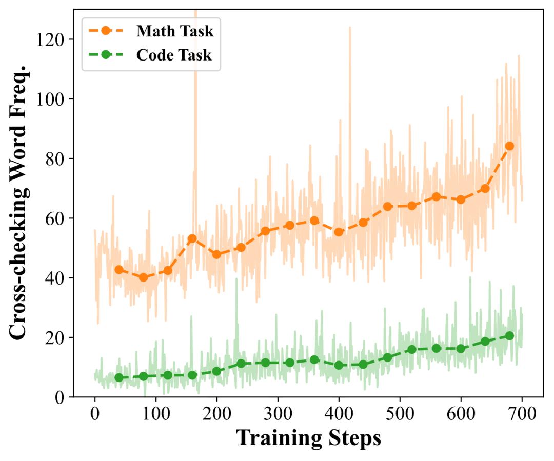 研究团队绘制了 PaCoRe 训练期间,数学和代码任务生成解决方案中 “交叉检查” 类词汇(包括 'reference', ' 参考 ', 'Refnumber', 'refnumber')的频率。训练在这两个领域都激发并放大了这种综合能力。值得注意的是,模型最初在代码任务上很少进行交叉检查,这佐证了图 1 中代码任务在 PaCoRe 训练前测试时扩展性差的现象。