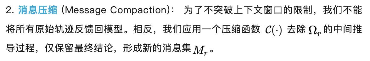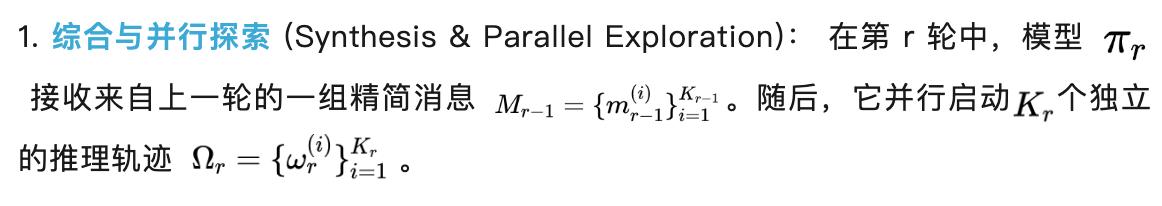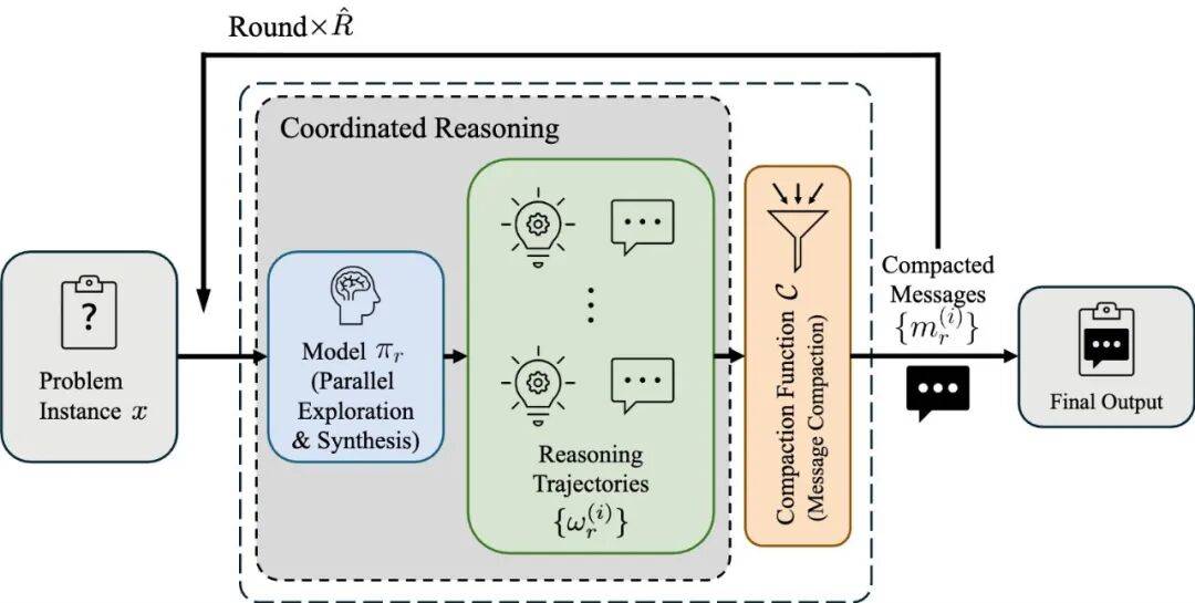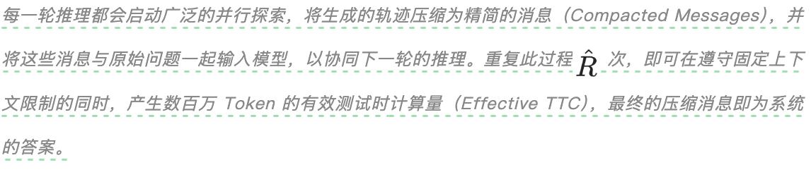 3. 迭代协同 (Iterative Coordination): 这些精简消息成为下一轮的上下文,使模型能够在多次迭代中修正理解、发现共识并纠正错误。为了确保收敛,最后一轮仅使用单一轨迹,生成最终的精简消息作为 PaCoRe 推理流水线的输出。