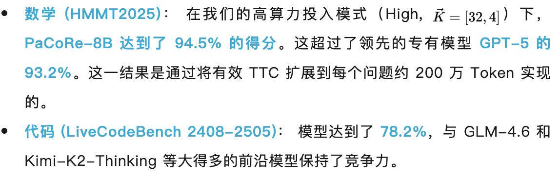 经过大规模、基于结果的强化学习(Outcome-based RL)训练,阶跃星辰研究团队的 PaCoRe-8B 模型掌握了综合发散性推理轨迹的能力。在 HMMT 2025 数学基准测试中,它取得了 94.5 的高分,一举超越了 GPT-5 的 93.2 分。这一成绩的取得,得益于模型在解决单个问题时,能够有效利用高达两百万 Token 的计算量。