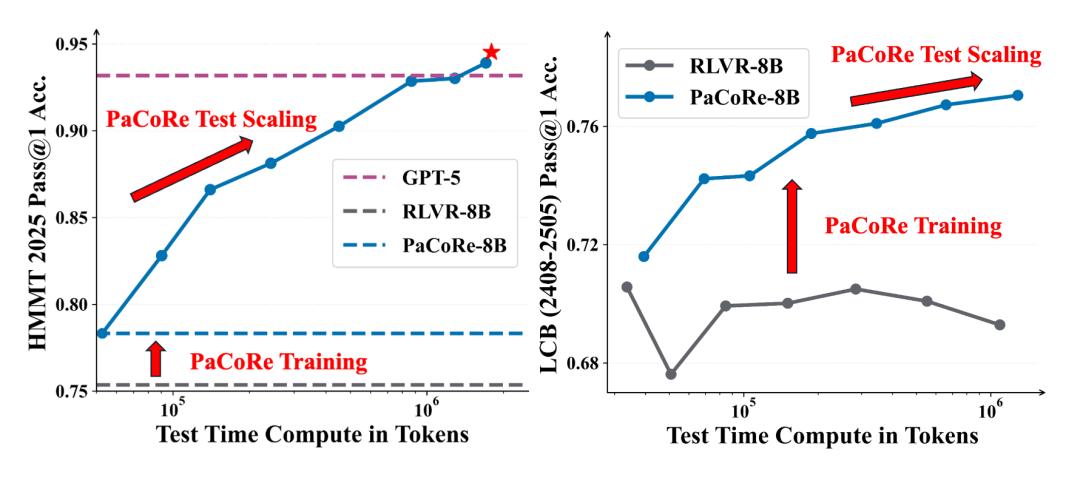 左图: 在 HMMT 2025 上,PaCoRe-8B 展示了惊人的测试时扩展(Test-Time Scaling)能力。通过增加并行轨迹(Parallel Trajectories)和协同轮次(Coordinated Rounds),性能稳步提升,最终超越了 GPT-5。右图: 在 LiveCodeBench 上,普通的 RLVR-8B 模型无法利用增加的测试时计算量,而 PaCoRe 有效地解锁了这种综合能力,随着计算量的增加带来了显著的性能提升。