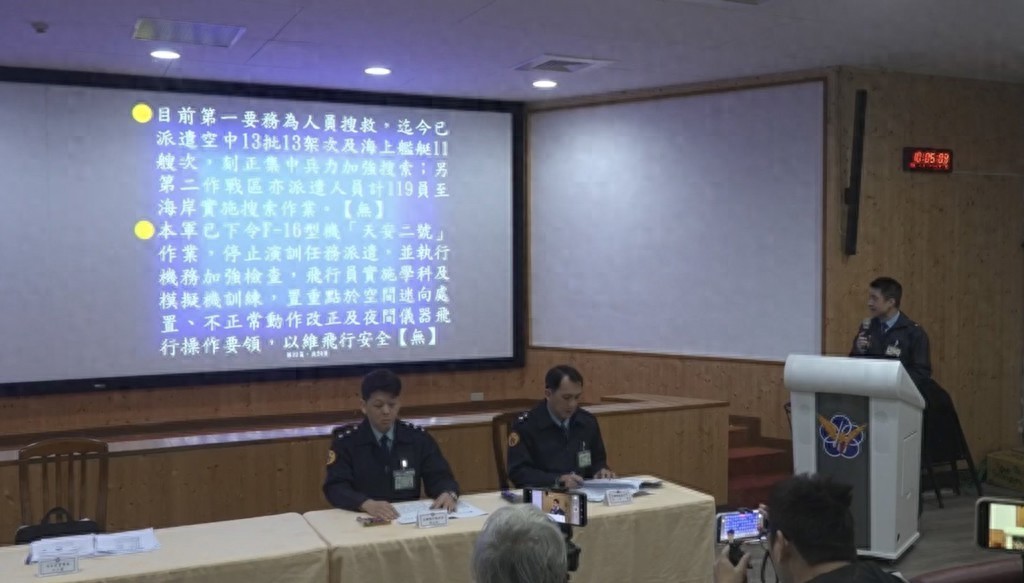 战机于晚间7时29分,在花莲丰滨乡东面约18.5公里海域疑似坠海,飞行员跳伞后下落不明。经过一夜海空搜救,至今仍无确切消息。