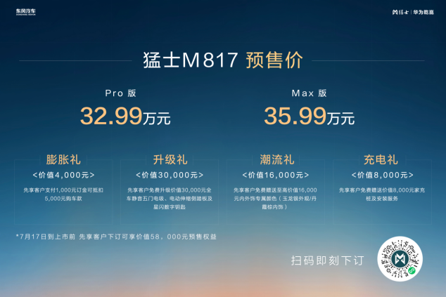 当硬派越野遇上智能科技,会碰撞出怎样的火花?7月17日,东风猛士与华为联手打造的豪华智能越野SUV——猛士M817正式开启预售,Pro版32.99万元、Max版35.99万元的定价,搭配价值5.8万元的限时预售权益,为硬派越野市场注入了强劲的智能基因。这场跨界合作,不仅是两大巨头技术实力的展现,更宣告着越野车型从机械性能为王,迈向"智能全域"时代的转折。